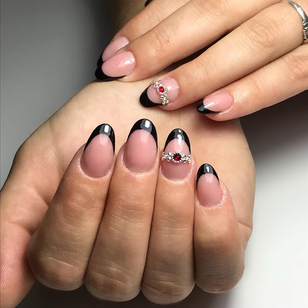 Круглая форма ногтевой пластины очень схожа по форме с овальной или миндалевидной. Отличием является то, что она имеет более плавные очертания, без резких углов. Великолепно будет смотреться на такой форме чёрный френч. Маникюр в этом оттенке сегодня не воспринимается так неоднозначно, как раньше, и пользуется большой популярностью. Френч в таком цвете подчёркивает ваш вкус и стиль. Чёрный цвет очень удачно гармонирует с розовым, белым и многими другими оттенками. Смело используйте технику выполнения френча не только в глянцевом варианте. Попробуйте добавить матовый оттенок или акриловую пудру в маникюр. Прекрасно смотрится чёрный френч с глиттером и фольгой по краю ногтя.