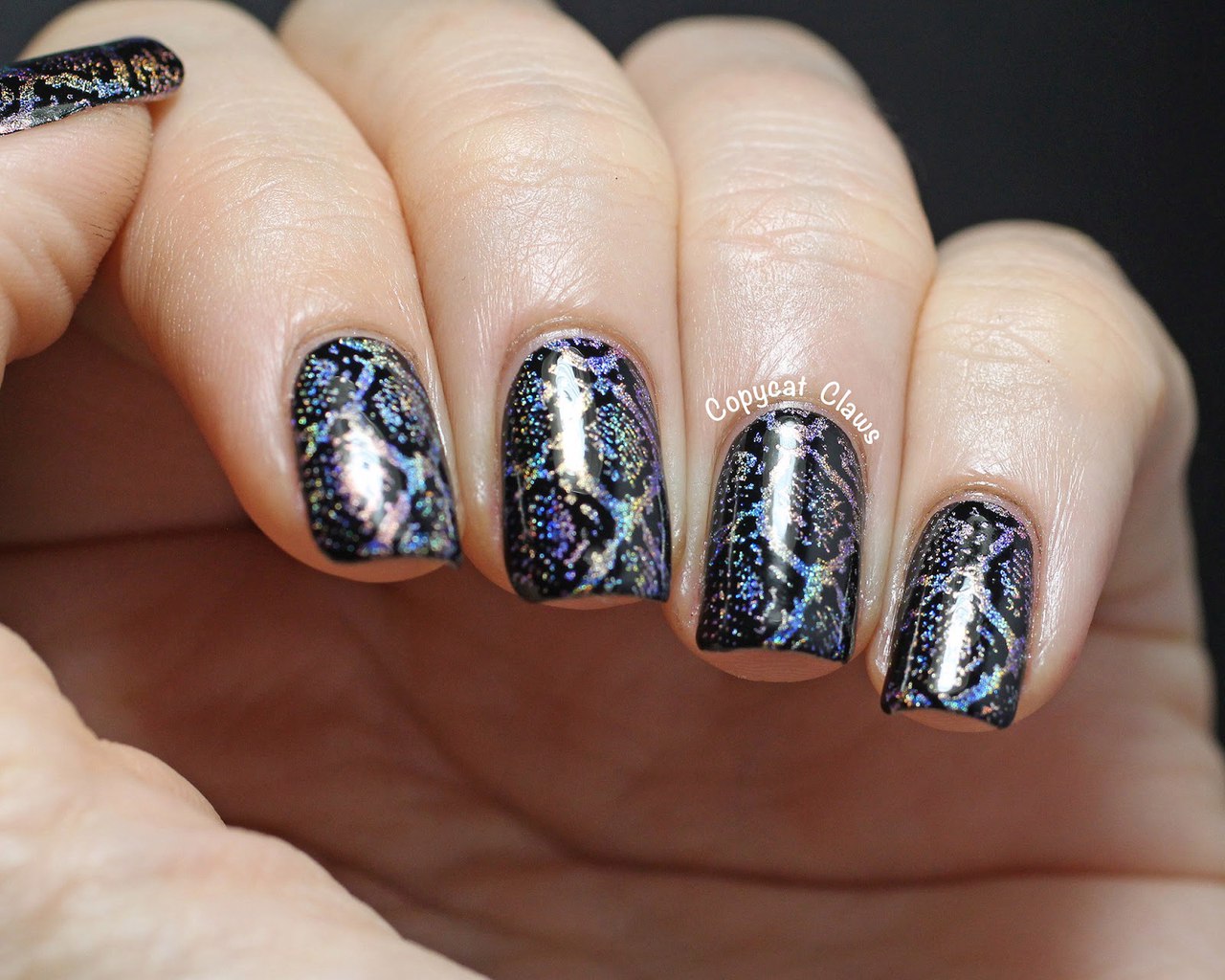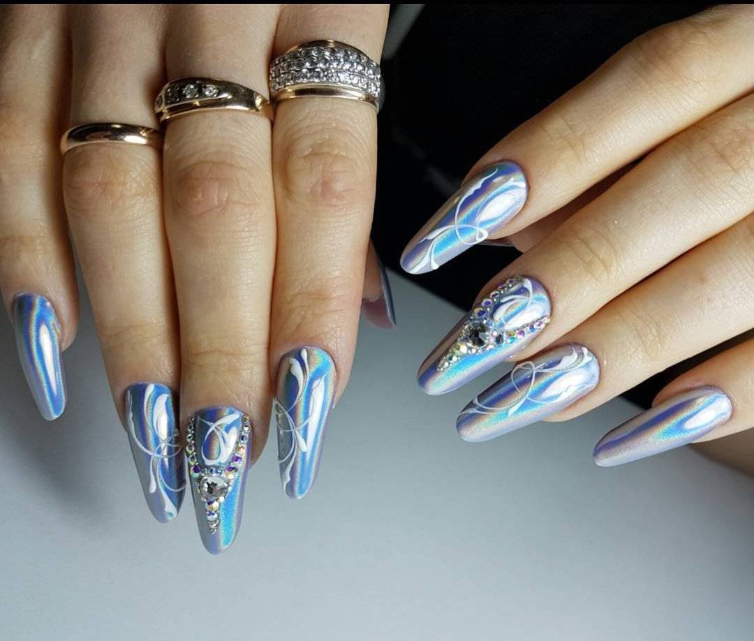 Голографическая сетка в декоре ногтей выглядит очень празднично. Причем выполнить такой маникюр очень легко и быстро. Выбрав любой цвет основной базы, который подойдет именно вам, нанесите сверху голографическую сетку и … «вуаля»! Праздничный маникюр готов.