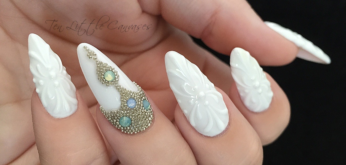 Если хотите сделать маникюр объемное кружево на ногтях, то в этом вам поможет гель краска. Ее нужно нанести на подготовленные ногти, распределить по пластине и нарисовать кистью или дотсом кружевные рисунки. Чтобы кружевной 3D дизайн получился, нужна сноровка, поскольку самой сделать маникюр гель краской будет неудобно.