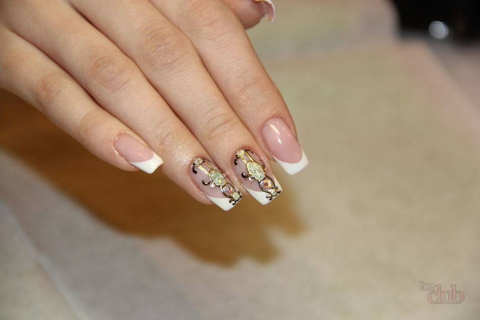 Для торжественных случаев, свадьбы стилисты рекомендуют использовать камни, стразы. Тогда маникюр будет выглядеть еще более праздничным, элегантным, утонченным.
