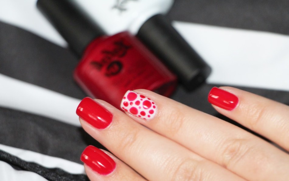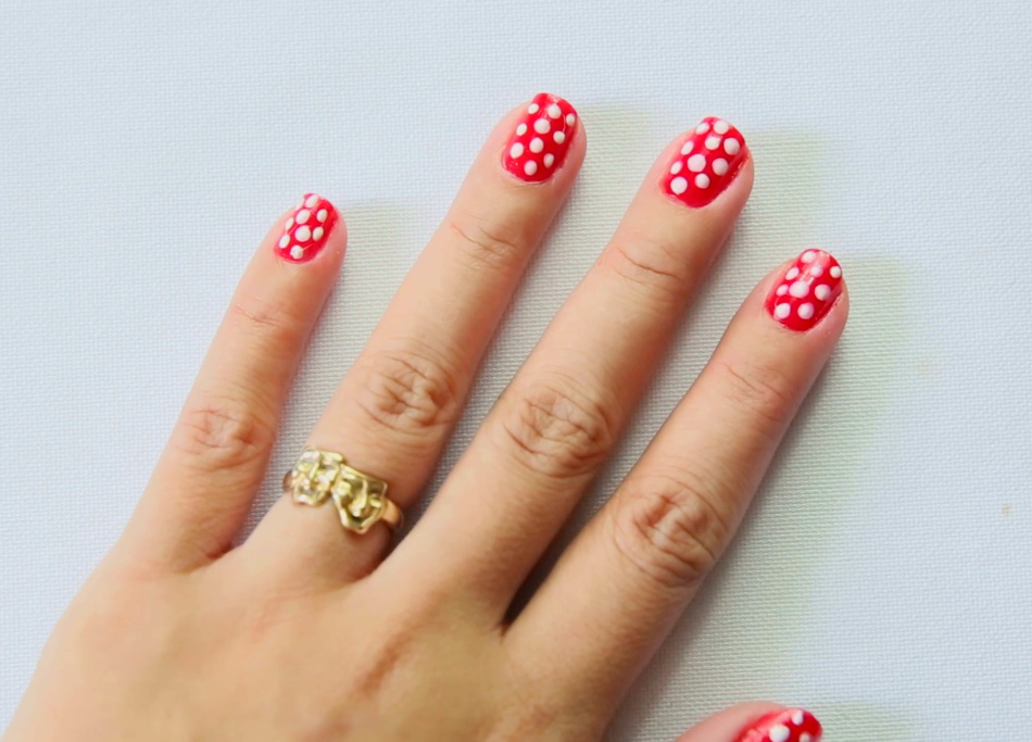 Красный лак — классический цвет для выполнения маникюра. Он дарит рукам особую женственность и всегда говорит о даме, как о страстной особе. Один из самых удачных точечных маникюров — белый горошек на красном фоне. Он всегда смотрится очень выигрышно и привлекательно. Такой маникюр смело можно назвать летним. Его следует совмещать с такими же элементами в гардеробе и образе, дополняя: