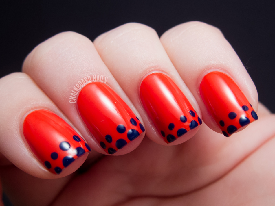 красный маникюр с синими точками
