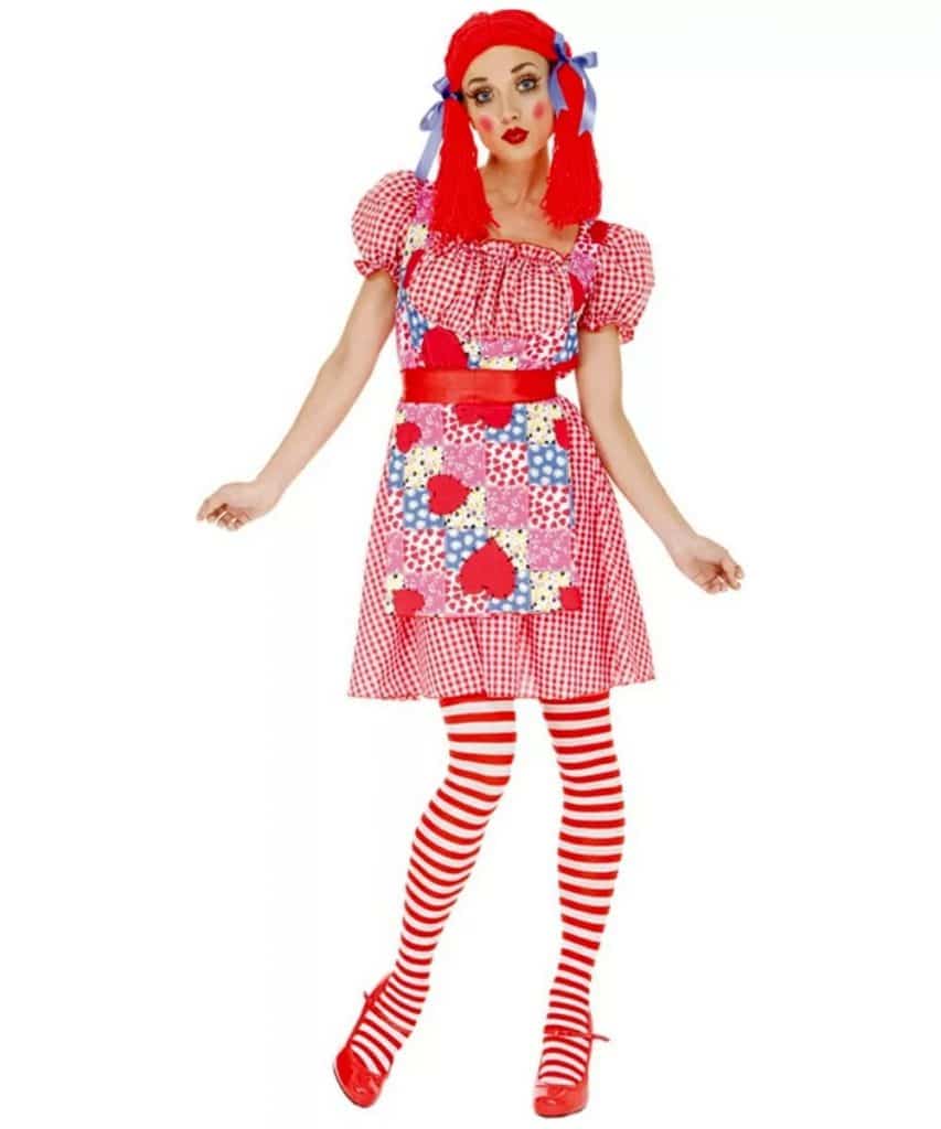 Для костюма тряпичной куклы подойдут яркие, но простые вещ: платья, сарафаны, комплект из юбки и блузки, шорты. Отлично будут смотреться в сочетании с цветными волосами полосатые или просто яркие гольфы. Для пущего эффекта на одежду тряпичной куклы можно нашить контрастные заплаты.