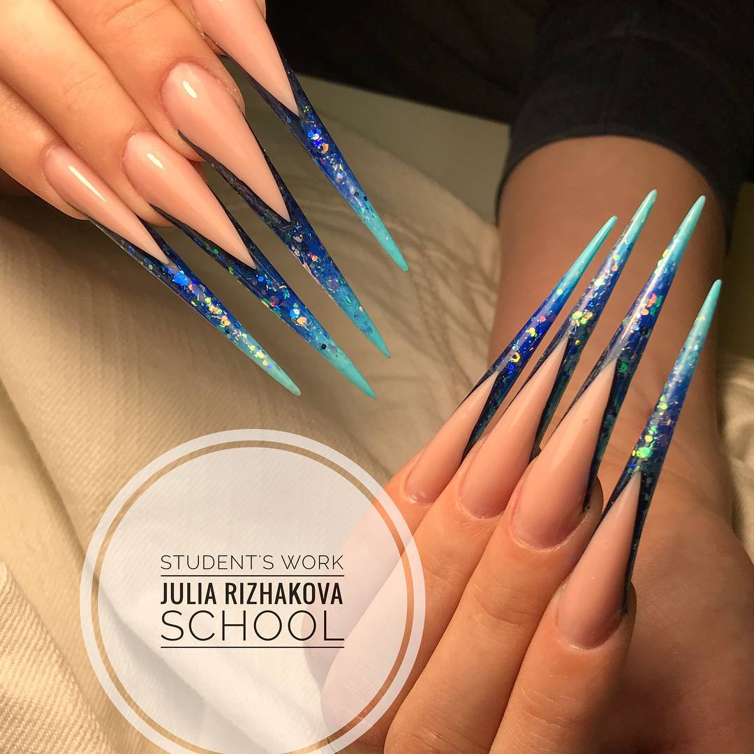 Достаточно экстравагантный вариант оформления ногтевых пластин. Выполняется такая форма маникюра на длинных ноготках. Особенность такой формы – заостренный кончик. Из-за своей неординарности и необычности, она имеет скромный круг поклонниц. Такой маникюр выбирают как правило эпатажные девушки, с яркой внешностью, которые стремятся всегда быть в центре внимания.
