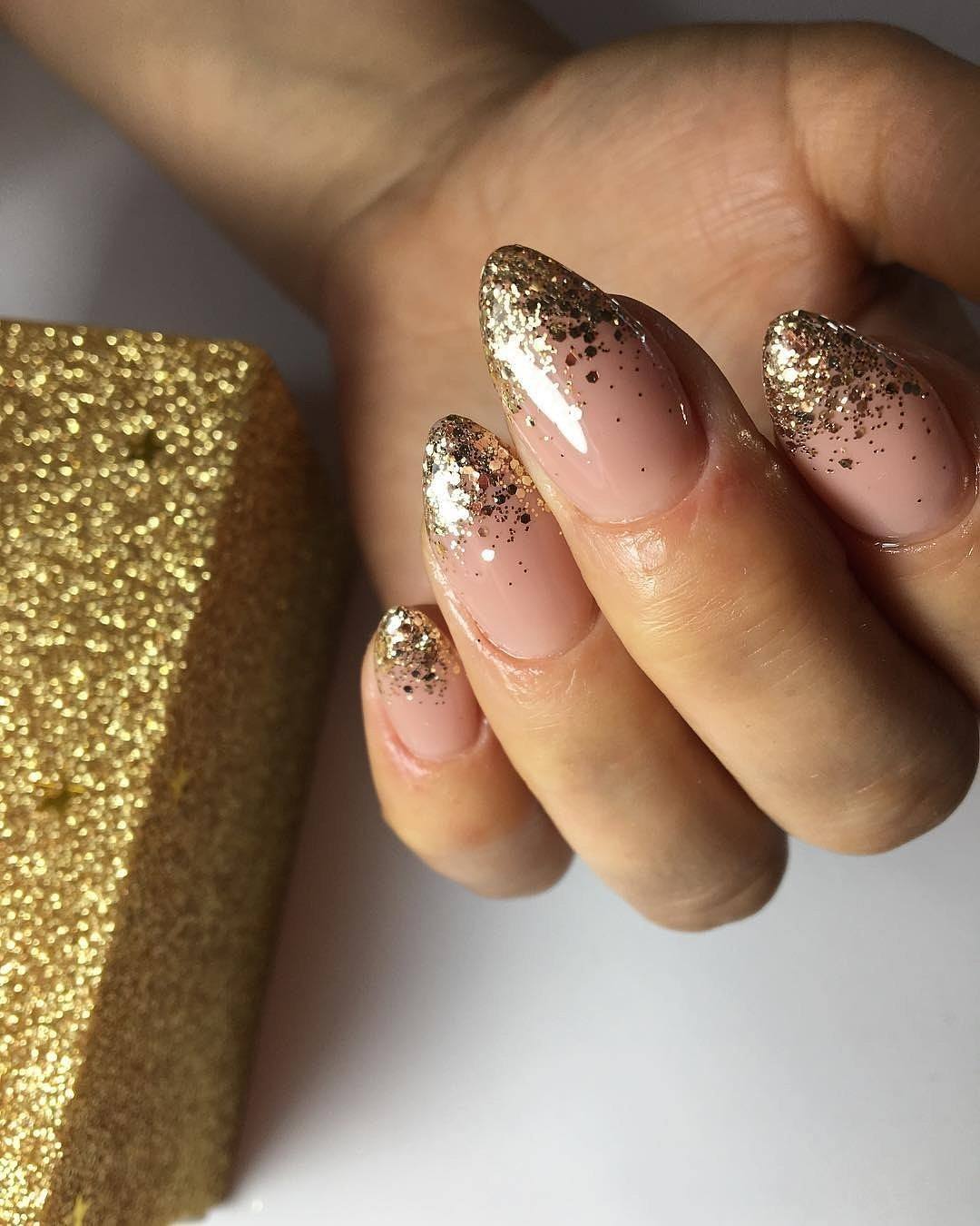 блестки на кончиках ногтей ложатся плотным слоем, постепенно пигмент становится более редким, а у основания полностью заканчивается;