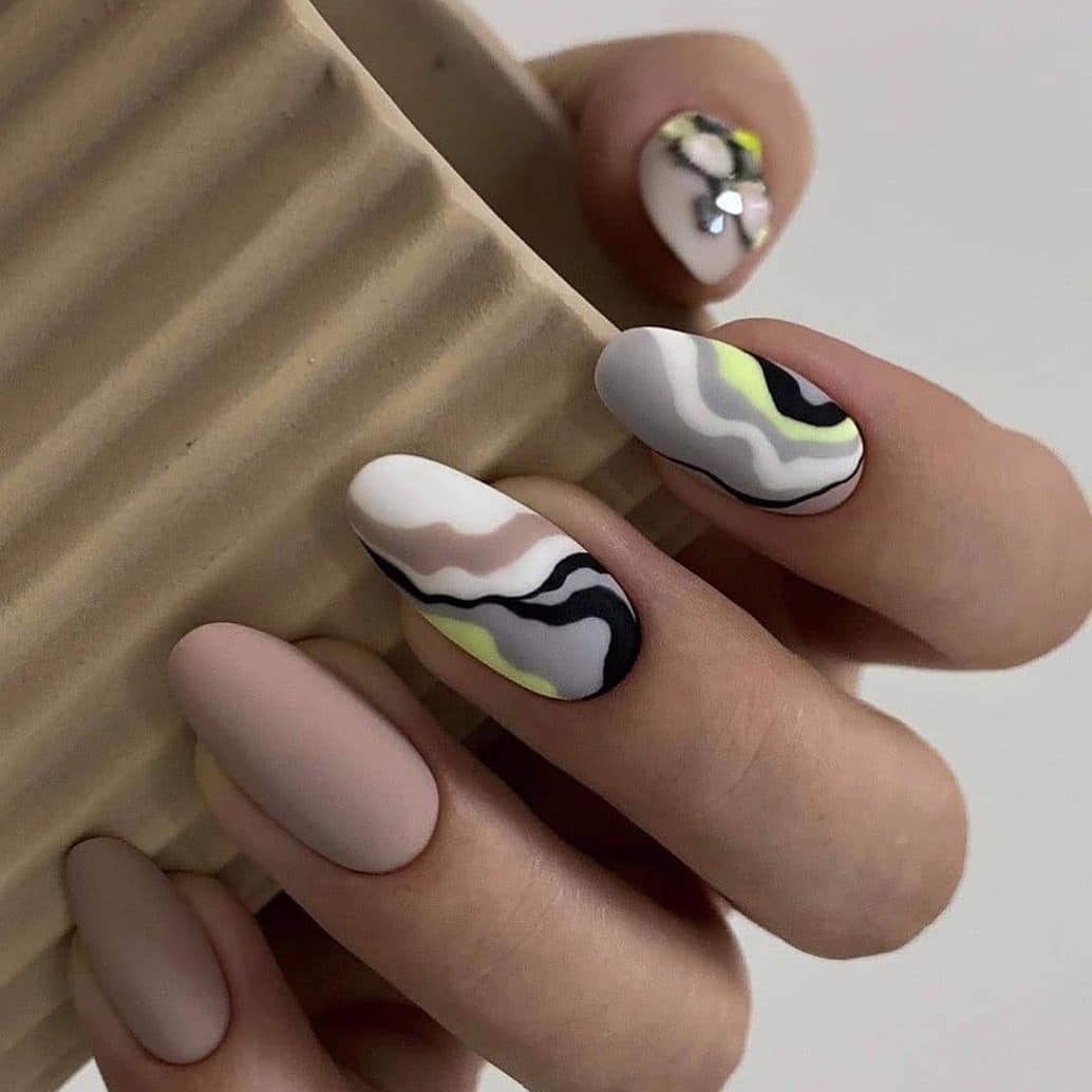 Броская абстракция завоевала списки модных трендов не только в фэшн-индустрии, но и в мире маникюра. Не бойтесь сочетать красочные оттенки и яркий декор. Тандем белого горошка, космических разводов и разнообразных линий — все это смотрится круто и новомодно. С таким дизайном вы будете выглядеть суперстильно и молодежно.