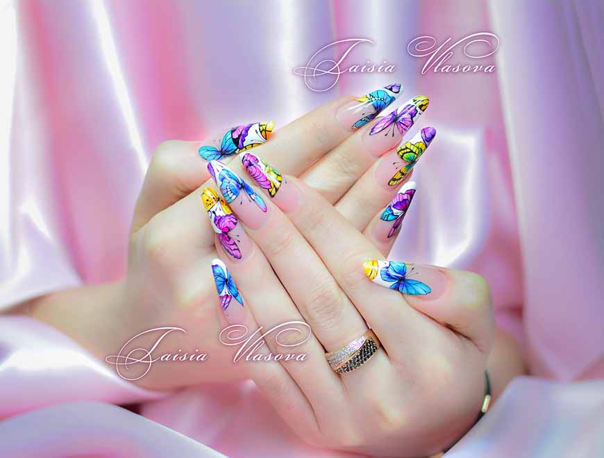 Рисунки акриловыми красками выполняются и на косметическом, и на гель лаке. Маникюр «бабочки» на ногтях является многоцветным, поэтому важно грамотно сочетать цвета основы и рисунка