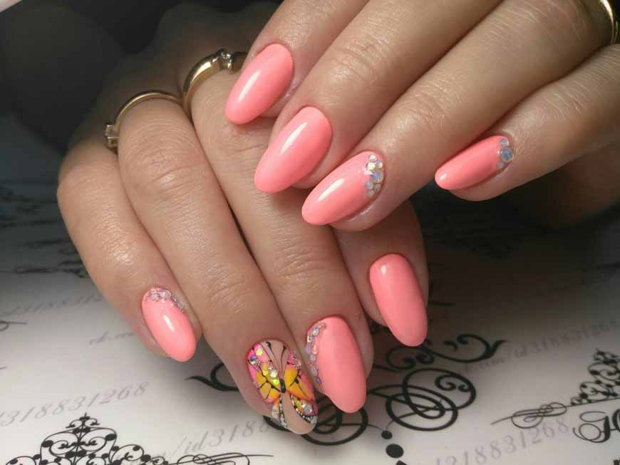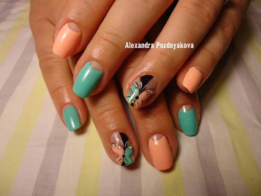 Особенность данного дизайна маникюра с бабочками заключается в его яркости, поэтому он подходит не ко всем нарядам и не в любое время года. Он будет прекрасно смотреться на руках весной и летом в сочетании с яркими цветными аксессуарами (бусами, серьгами, браслетами, кольцами).