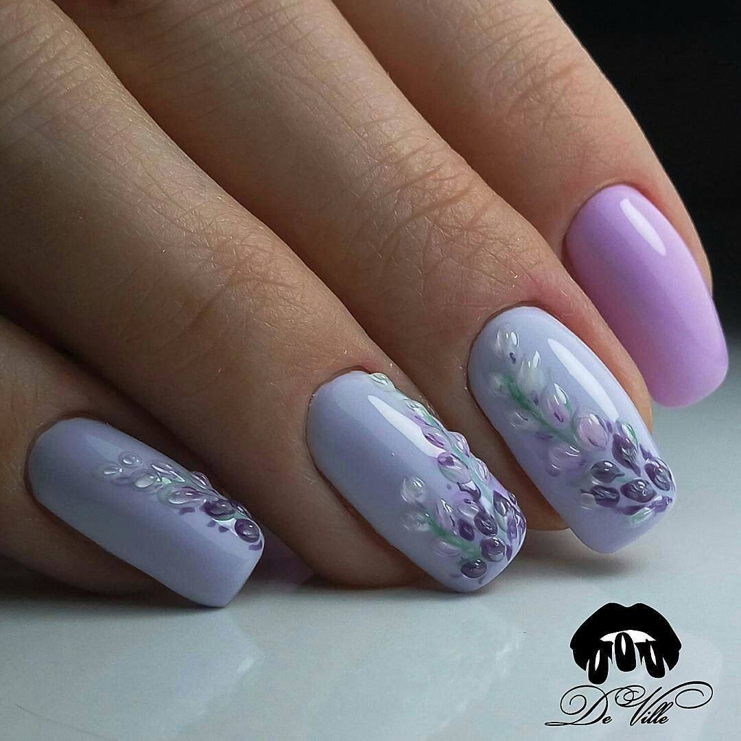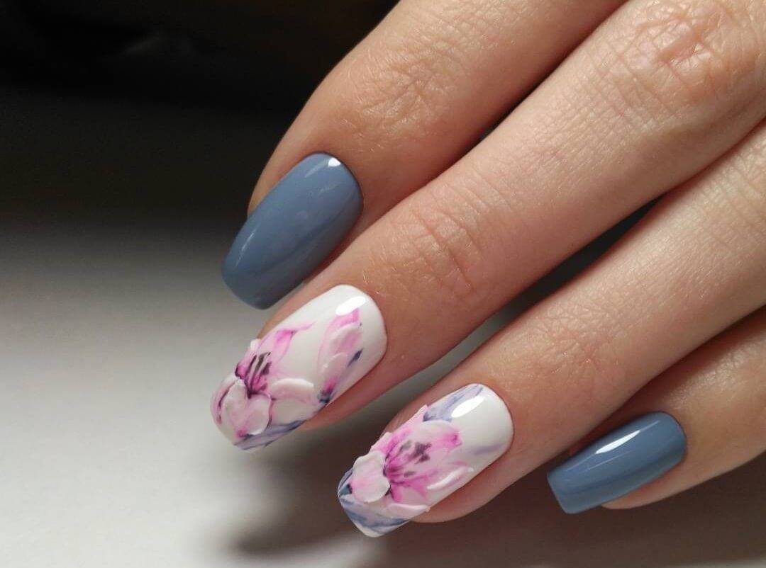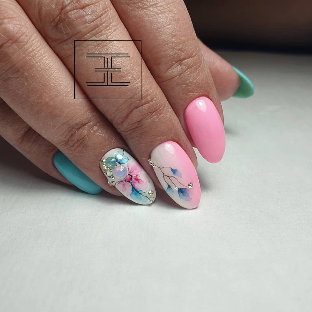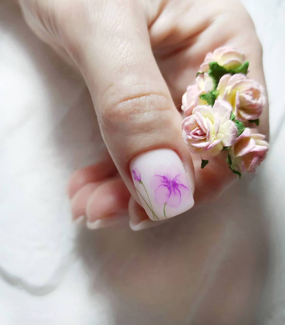 Рисунок акварелью в виде цветов и других флористических мотивов будет мust нave в летнем маникюре сезона 2020. Цветочный рисунок может быть в стиле минимализм (простой и маленький в виде акцента), а может быть и целая роспись на ногтях. Также в виде росписи акварелью очень красиво смотрятся бабочки, птички, которые тоже можно изобразить в летнем маникюре.