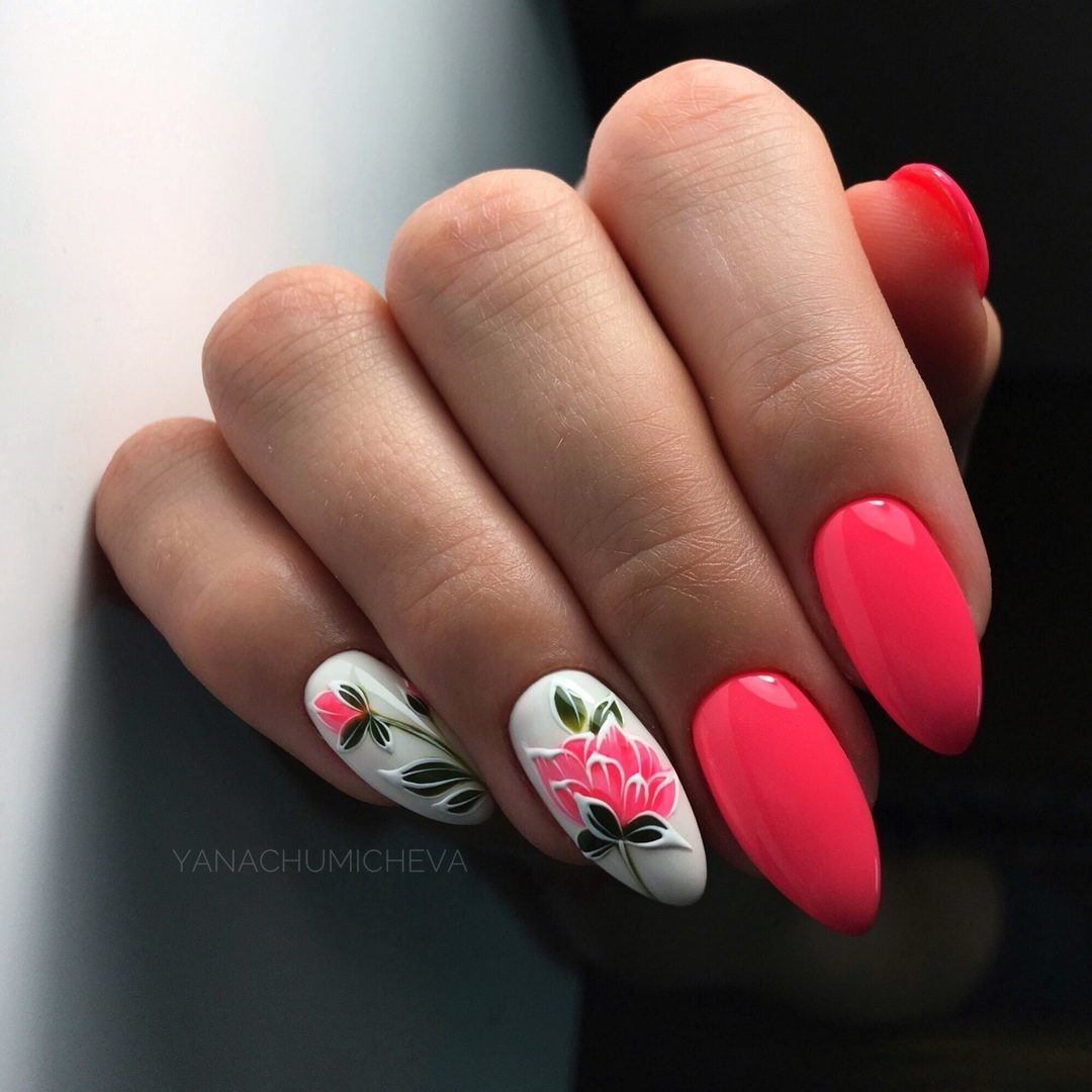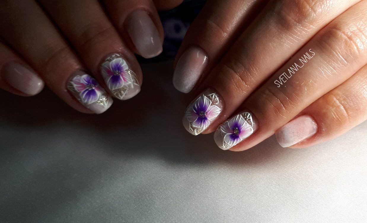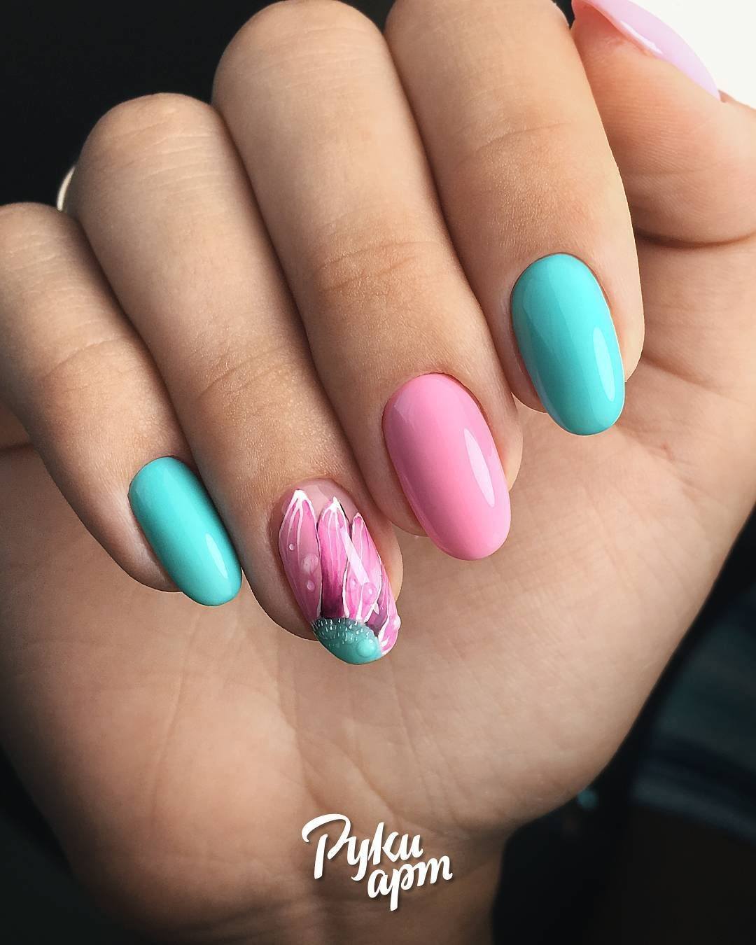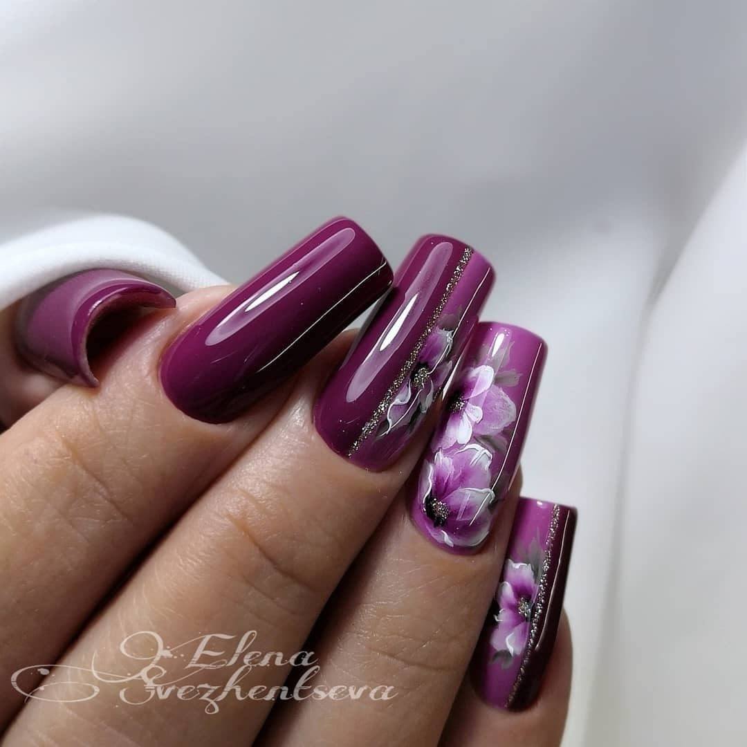 Рисунок акварелью в виде цветов и других флористических мотивов будет мust нave в летнем маникюре сезона 2020. Цветочный рисунок может быть в стиле минимализм (простой и маленький в виде акцента), а может быть и целая роспись на ногтях. Также в виде росписи акварелью очень красиво смотрятся бабочки, птички, которые тоже можно изобразить в летнем маникюре.