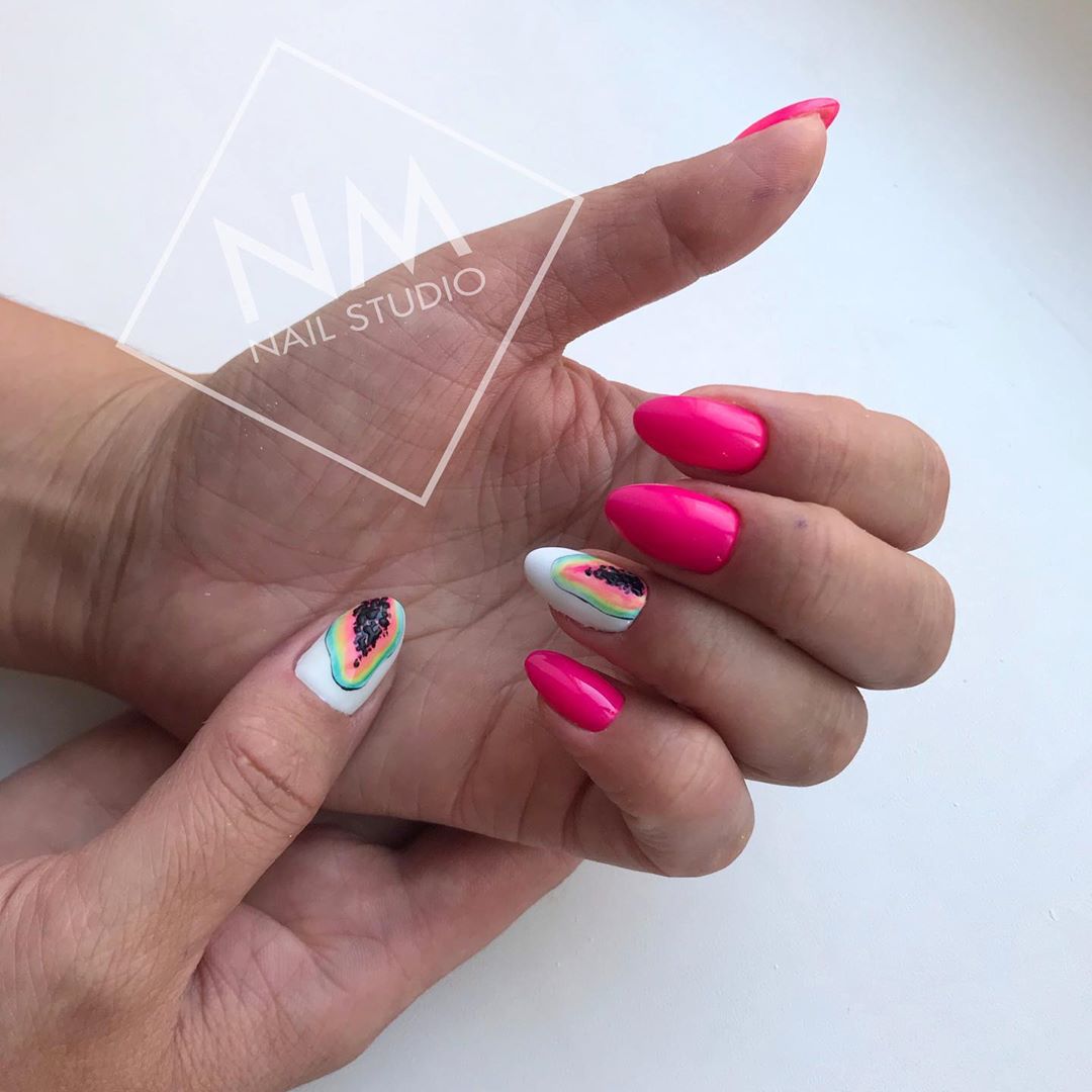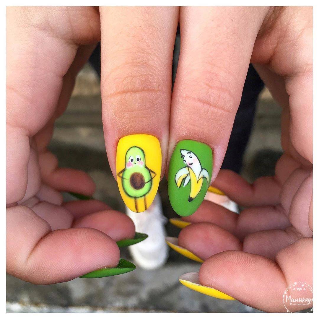 В тренде летний маникюр с клубникой, арбузом, малиной, ананасом, бананом, киви, авокадо и даже с изображением апельсина и лимона.