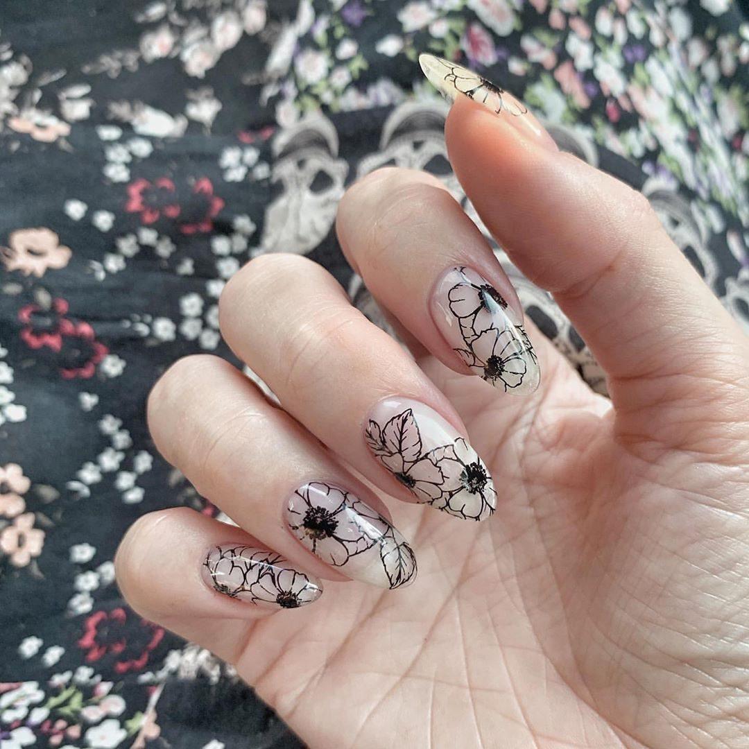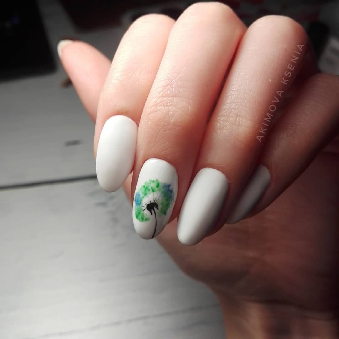 Особенно летом 2021 будут ценится простые одуванчики. Они выполняются в едином или множественном числе, где каждый цветок сможет украшать свою часть ноготка. Больше всего пользуется популярностью черно-белый рисунок на пастельном тоне.