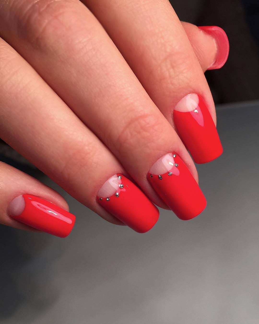 В этом варианте, на ногти наноситься основной (красный) цвет. После чего по верхней границе лунулы закрепляется стикер. Далее лунула закрашивается в белый цвет. Как только гель-лак просохнет в УФ лампе, наноситься финишное покрытие, которое придаст ногтям особый блеск и устойчивость к внешним воздействиям.