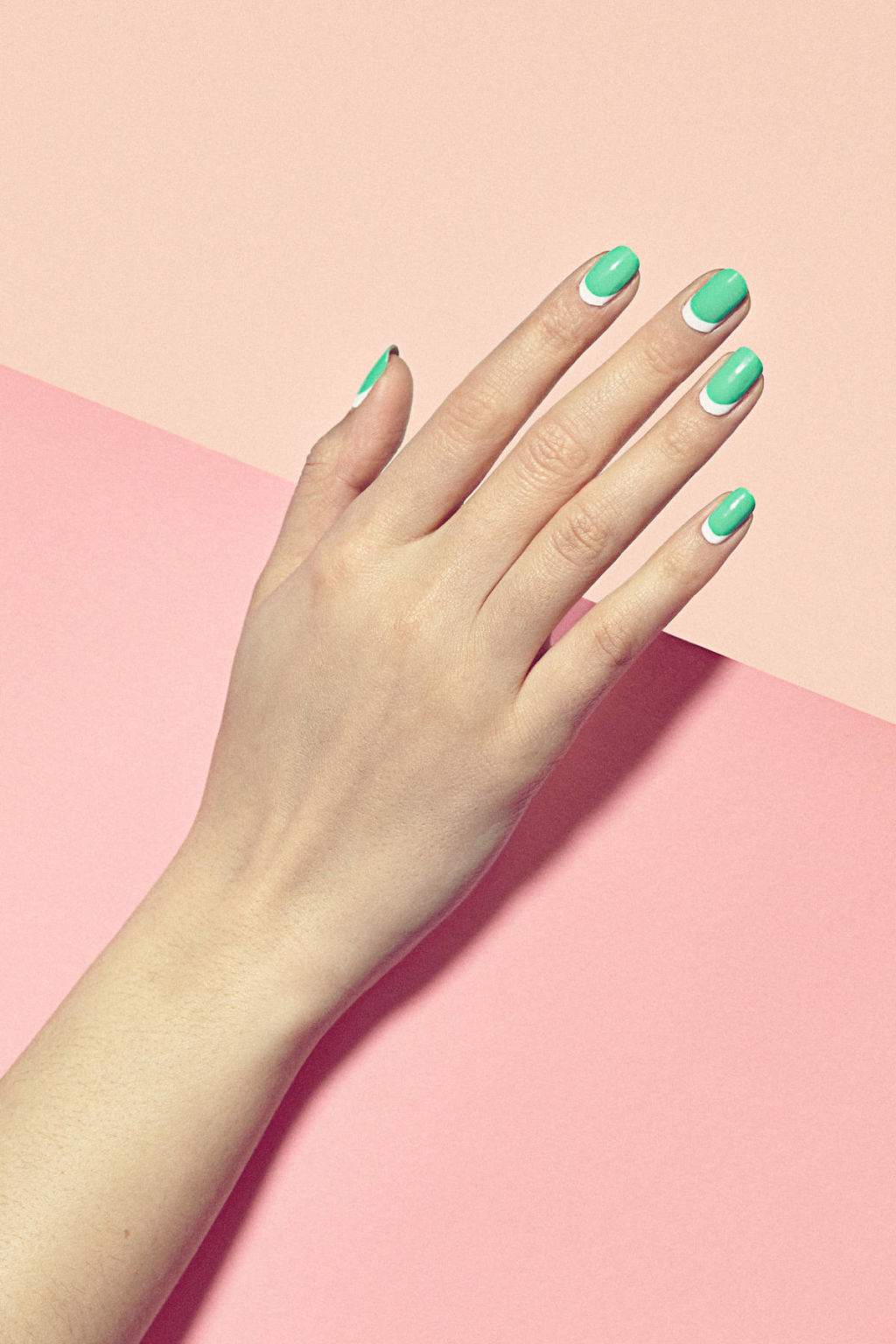 Шаг пятый. Не дожидаясь полного высыхания лака, подцепите край трафарета и медленно снимите его с ногтя. Если вы пересушите лак, то линия «улыбки» получится слишком выпуклой и может растрескаться, а если недосушите — лак может растечься. У вас должна получиться идеальная граница перехода между лаками.