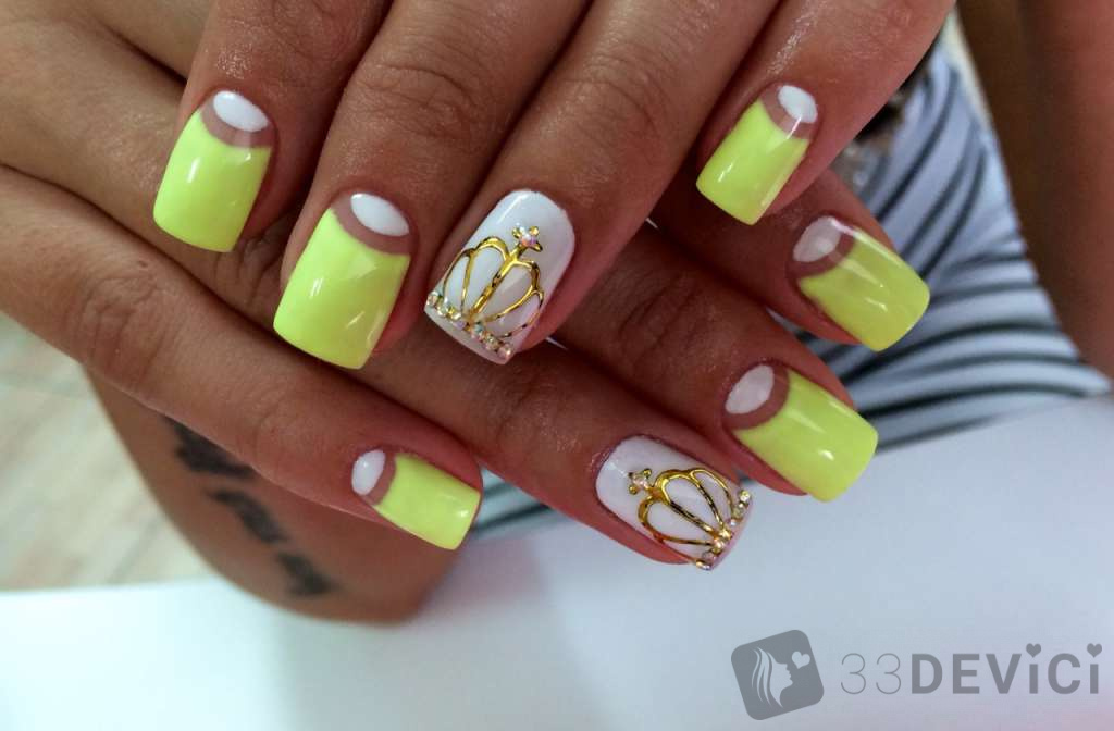 Часто используемый дизайн, в котором объединены французский и лунный маникюр является одним из главных трендов. Основной нюанс его выполнения, оба полумесяца должны смотреть в одну и ту же сторону. Хотя изгиб самой лунки может быть любым.