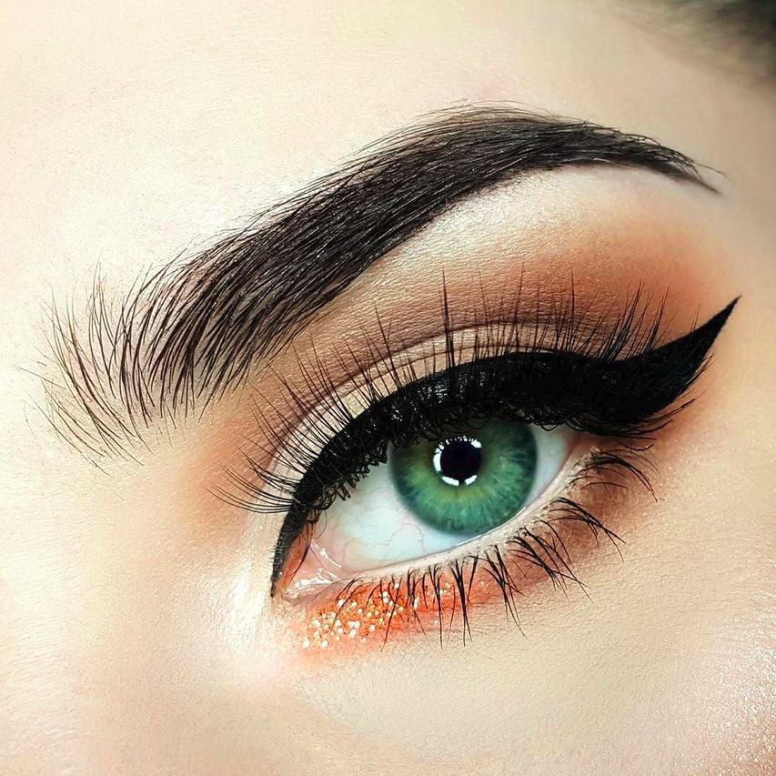 - Если цвет глаз зеленый, прекрасно подойдут все тени теплой цветовой палитры. Например, коричневые, золотистые, изумрудные, а также кремовые. Именно такие оттенки будут идеально подчеркивать глубину глаз.
