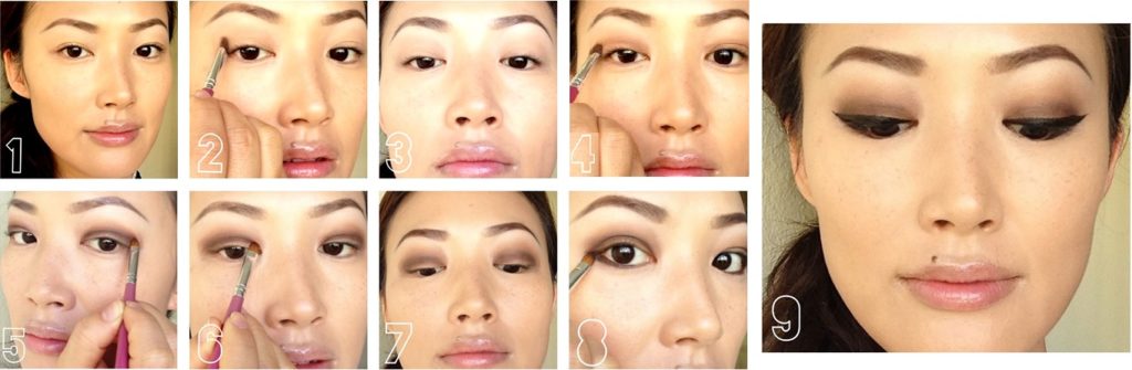 На фото пошагово показан макияж для узких глаз азиатского типа: