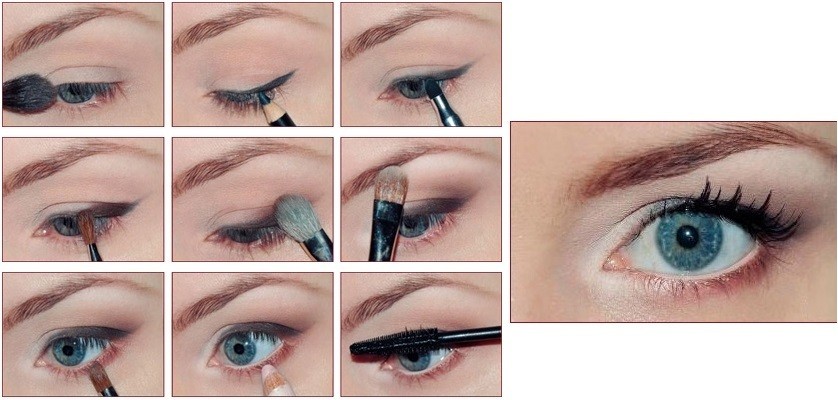 Первым этапом нанесения макияжа для больших выпуклых глаз является наложение основы при помощи нейтральных оттенков теней на все подвижное веко. Для женщин холодного типа можно использовать светло-розовый оттенок, для дам теплого типа возможно применение светло-серого тона. Такими же тенями проводи линию под бровью. Контурным карандашом цвета индиго вдоль линии роста ресниц не до конца века проводится стрелка. Тенями такого же цвета стрелка тщательно растушевывается, хвостик ее подтягивается вверх. Серыми тенями подрисовывается нижнее веко вдоль линии роста ресниц.