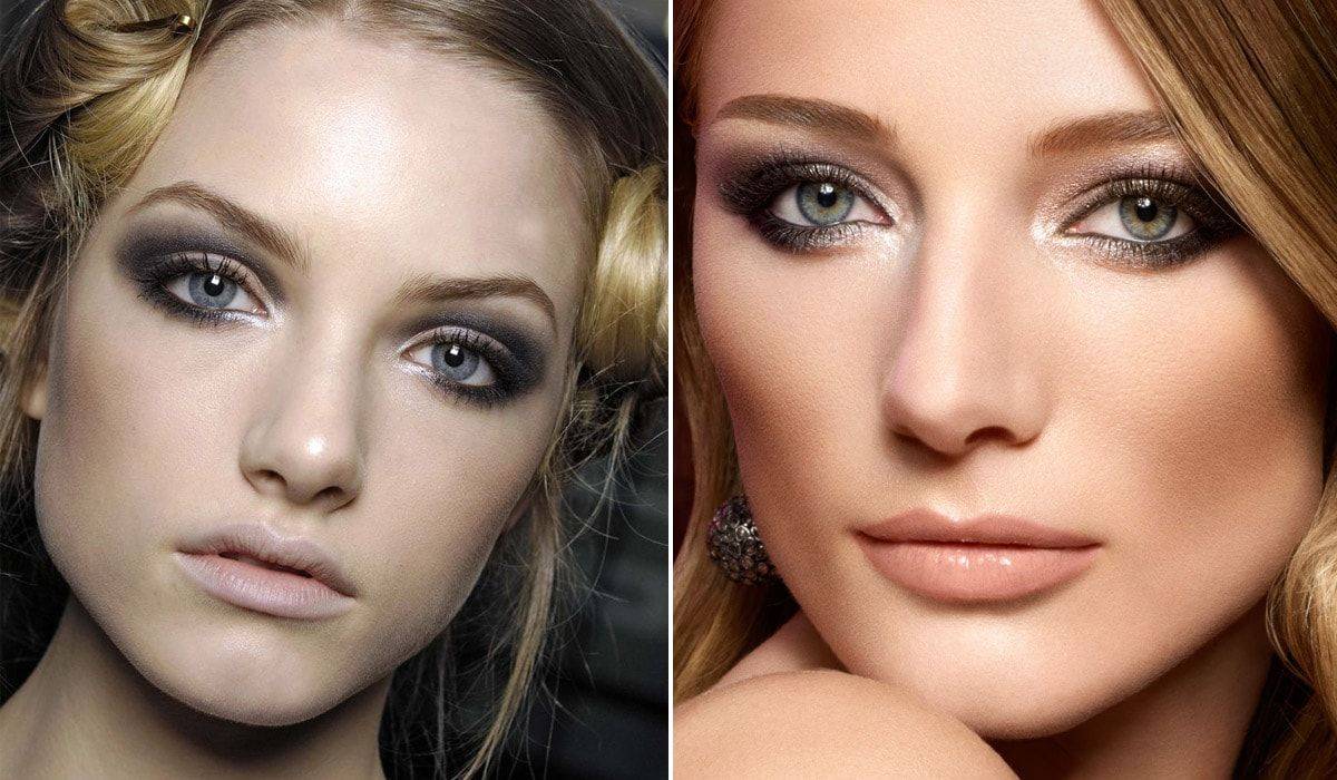 В качестве вечернего образа можно выбрать дымчатый макияж (смоки-айз), который хорошо комбинируется как с чисто черными тенями, так и с темно-серыми либо темно-синими тенями под цвет глаз. Губы лучше оставить нетронутыми (можно нанести перламутровый блеск). Выбирая, какой цвет теней подходит к серым глазам, помните, что главным правилом для такого макияжа в особенности для блондинок является минимализм. Блондинкам, обладательницам голубых радужек не помешает подвести карандашом брови. При этом оттенок бровей должен максимально сочетаться с тоном корней волос. Под запретом черный тон: разрешен серый или же светло-коричневый.