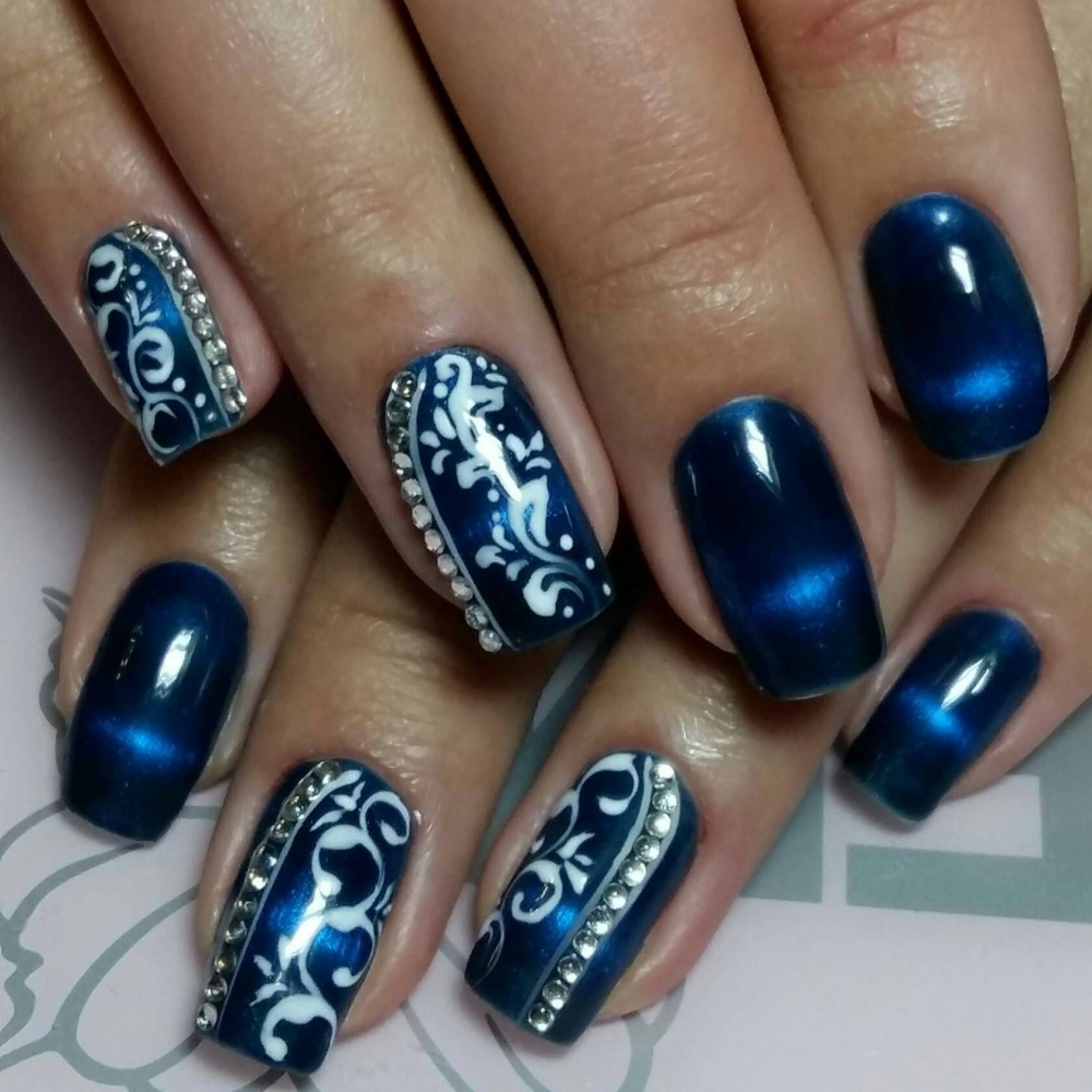 Френч. На длинных ногтях как нельзя лучше будет смотреться маникюр кошачий глаз с френчем. Вы можете оформить один или несколько пальцев в данной технике, в то время как остальные будут покрыты магнитным гель-лаком. Также можно нарисовать улыбку и на уже готовом покрытии с магнитным рисунком.