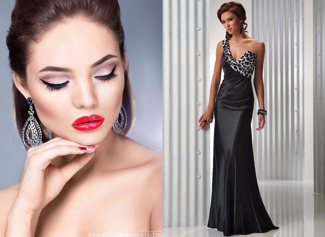 Самое основное правило – темнота платья не должна поглотить ваше лицо. Именно лицо в вашем образе, а не платье должно превалировать. Тон вашего лица должен быть идеален, поэтому внимательно отнеситесь к выбору основы. Из теней лучше всего предпочтение отдать тем, которые имеют металлический оттенок. В вечернее время можете воспользоваться помадами красных оттенков.