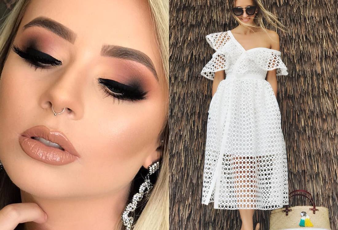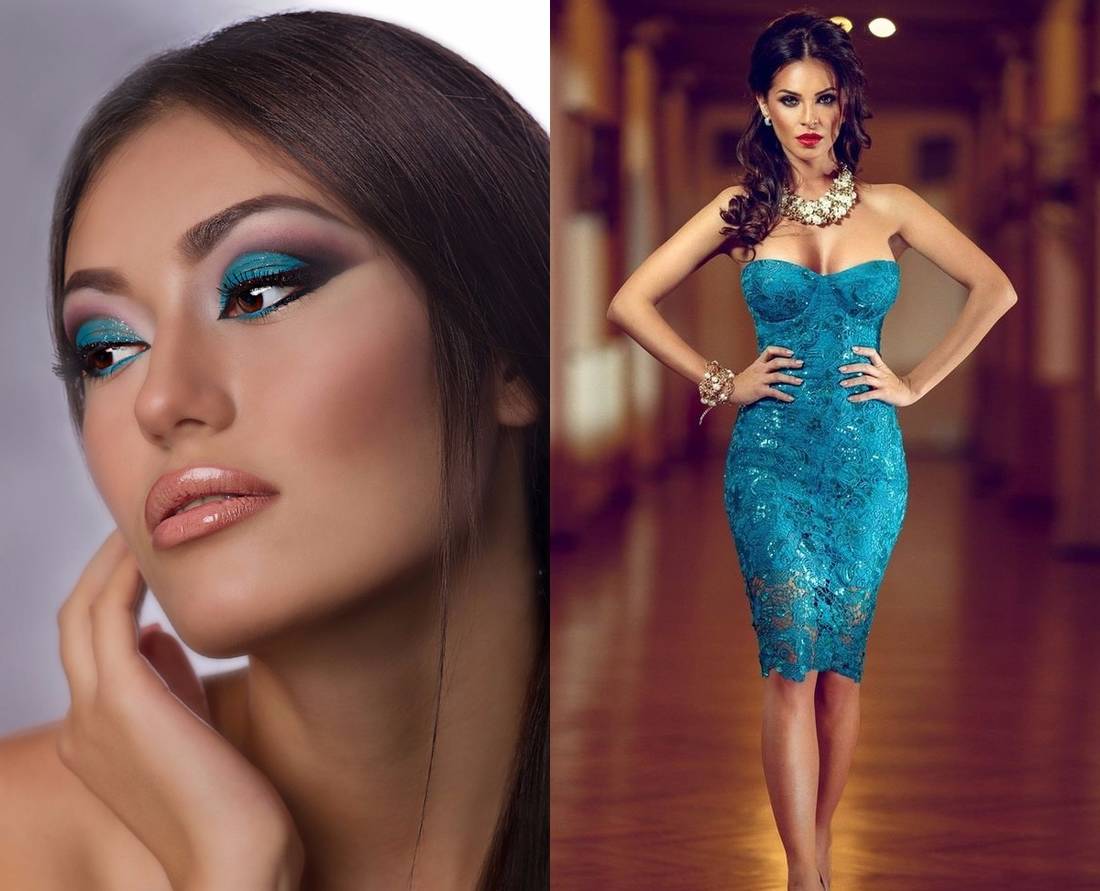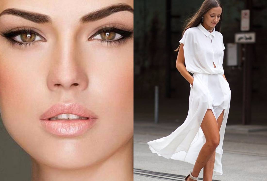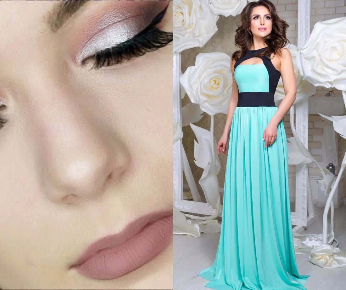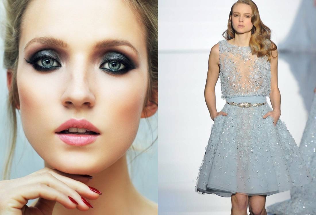 Бело-синее платье можно обыграть при помощи теней серебристого оттенка на внутреннем уголке глаза, серо-голубых – на внешнем. Для вечернего образа в таком случае подойдет вариант смоки айс, где оттенок использованной косметики идентичен темным деталям наряда. Этот же мейк можно выбрать, если платье сине-черное. Здесь также будут уместны любые оттенки серого. Следует быть осторожными, если платье выполнено в сине-зеленых тонах. Главное – соблюдать умеренность и использовать тени приглушенной гаммы, лучше, если они будут коричневатыми.