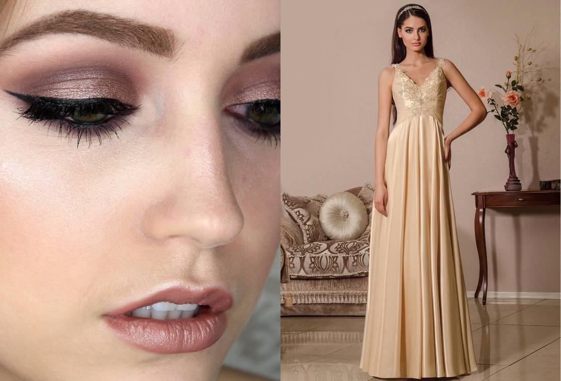 Акцентировать внимание на прическе и платье позволит макияж nude. Чтобы make up не сливался с нарядом, добавьте ему блеска