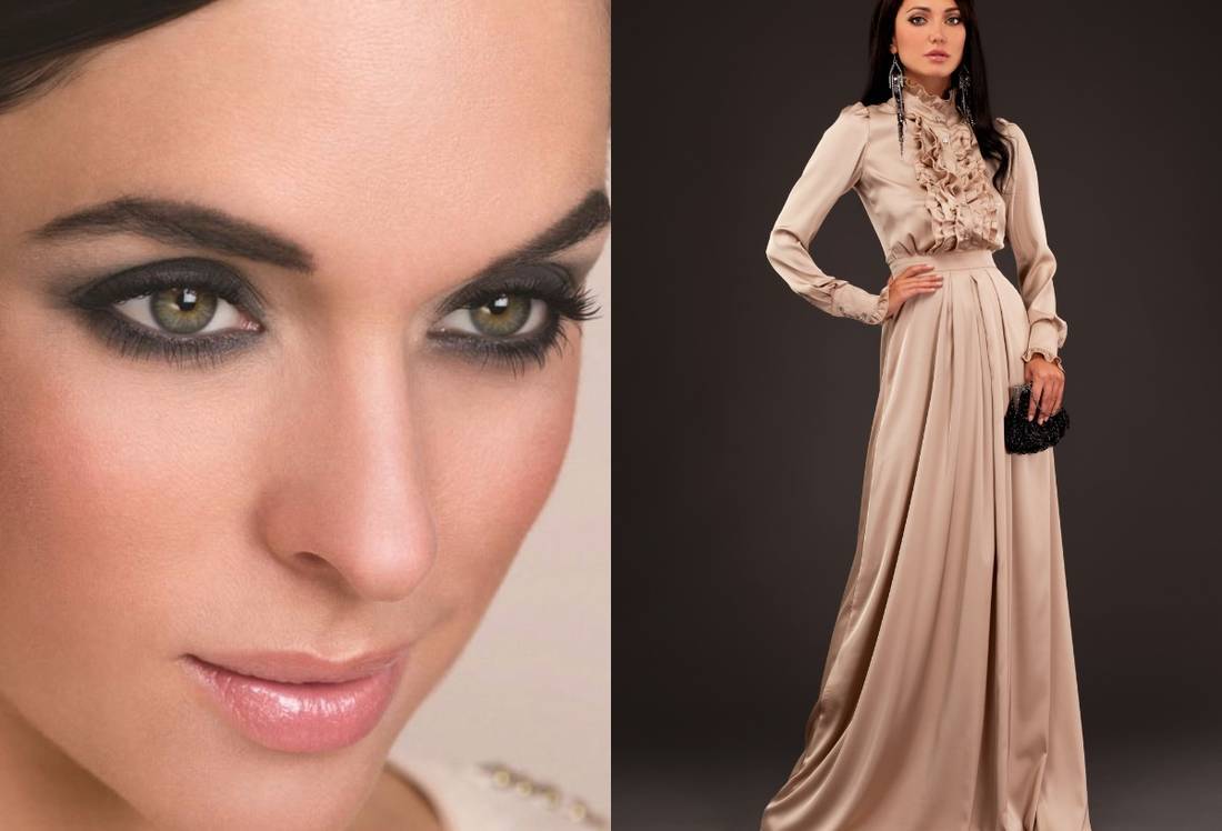 Привлечь внимание к глазам позволяет матовая текстура теней нейтральной палитры. Тени – шоколадных либо коричневых тонов. Под бежевое платье подойдут румяна естественной гаммы
