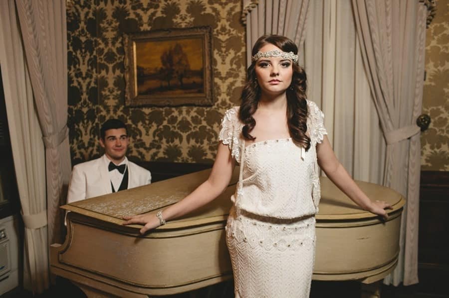 Замечательным дополнением наряда невесты в стиле Гэтсби станет боа, меховая накидка, перья. Не забудьте также о миниатюрной сумочке-клатче, непременно расшитой блестящими деталями и пёрышками.