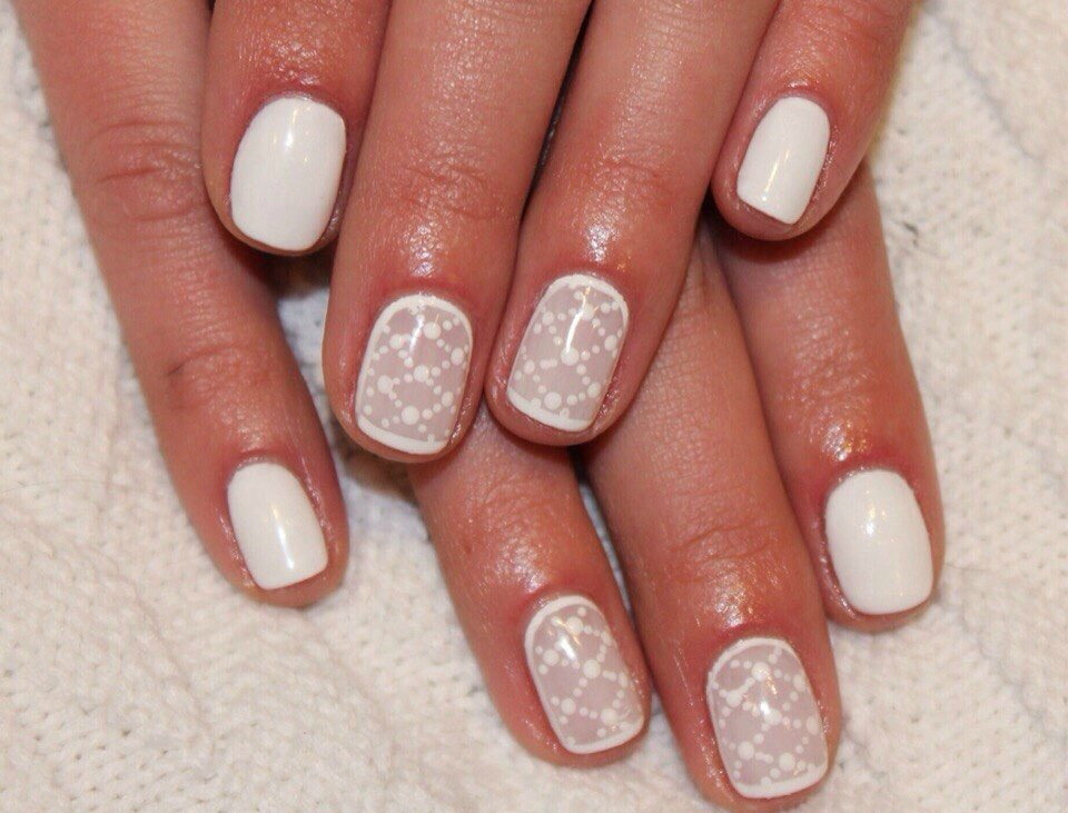 Мы рассмотрели маникюр под названием «черная вуаль» на основе темного цвета. Но ведь вуаль и колготки бывают белыми и других цветов. Этот вариант станет отличным решением для свадебного дизайна ногтей невесты. Выполняется он очень легко: