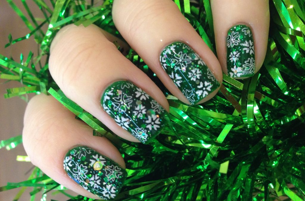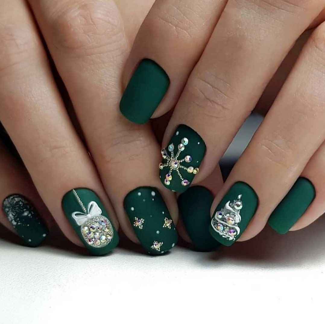 Зимний зеленый маникюр подразумевает сочетание с красным, белым и синим тоном. По обыкновению, он ассоциируется с одним из символов года – елкой, именно поэтому ее так часто можно увидеть зимой на ноготках.