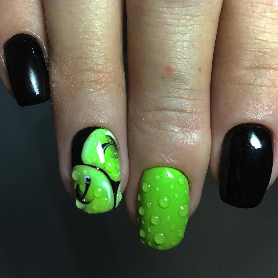 Черно-зеленый дуэт превосходен в растяжках и градиентах. Не менее эффектно выглядит матовый черный в комбинации с фольгой или втиркой зеленой палитры. Также черный графит является самым подходящим фоном для зеленых блесток.