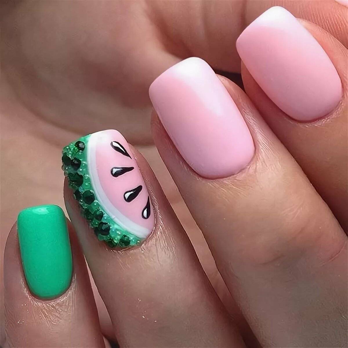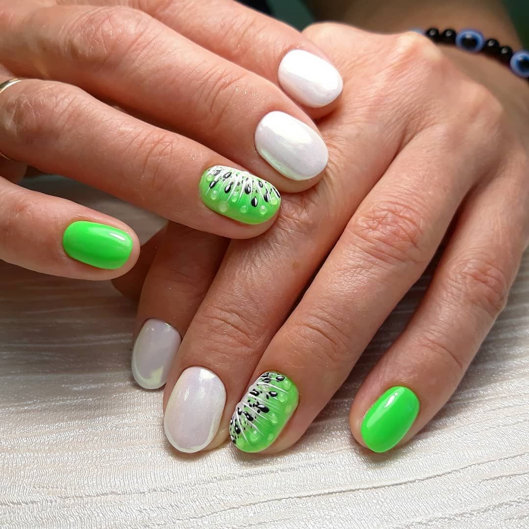 Для летнего зеленого маникюра больше всего подойдет оттенок молодой травы и нежный приглушенный ментоловый. Такой маникюр просто немыслим без рисунков фруктов: