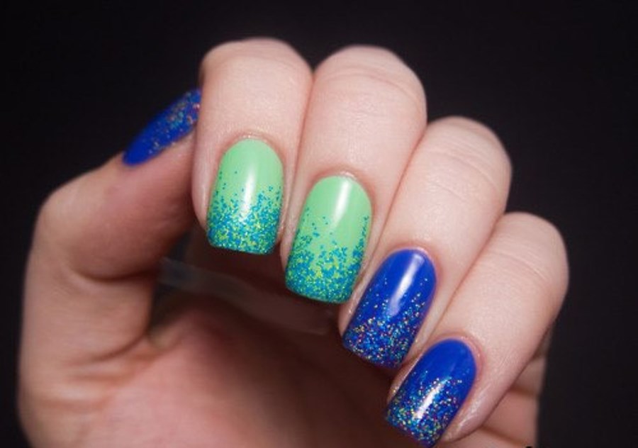 Зелено-синее и зелено-голубое сочетание на женских ноготках вызывают ассоциации с ясным весенним небом и сочной зеленью. Эти два оттенка не часто встретишь в маникюре одновременно, поэтому, воплощая подобную комбинацию в жизнь, надо быть весьма осторожным.