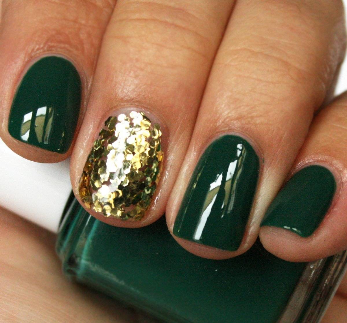 Зеленый цвет, дополненный золотом, создает на ногтях необыкновенное сочетание. Такой маникюр может сиять различными оттенками, для этого достаточно лишь выделить один пальчик. Ирина, мастер по маникюру: «При таком маникюре стоит выбирать темно-зеленые тона, в противном случае золотой цвет не будет так ярко выделяться на его фоне».