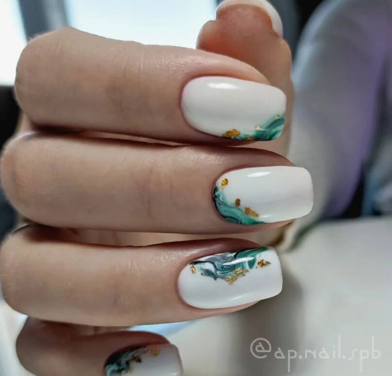 Разнообразив зеленый цвет белым в маникюре, можно сделать лук более легким и свежим. Белоснежные ноготки можно украсить изумрудными рисунками в виде: