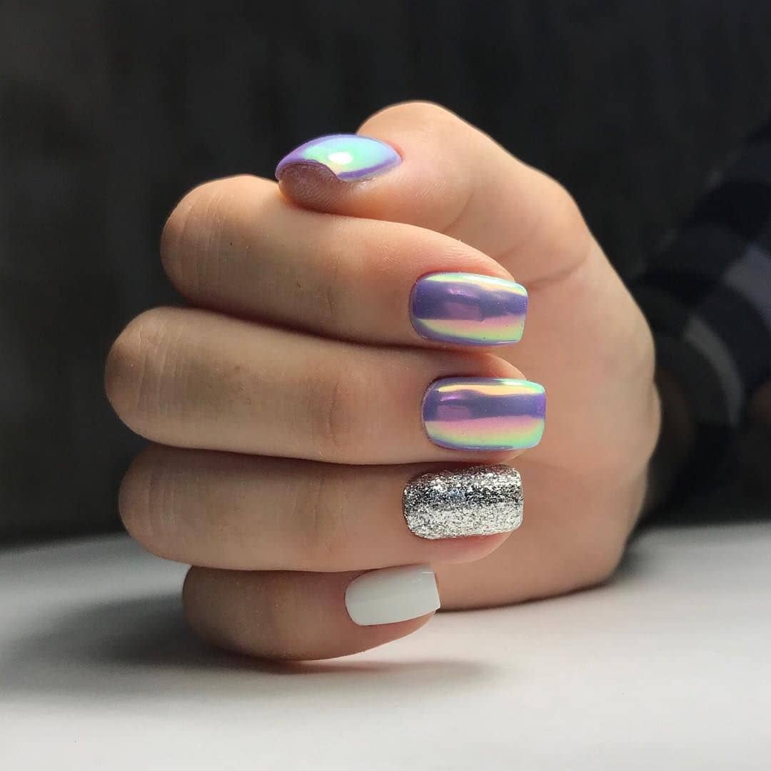 Современный модный молодежный маникюр в светлых цветах с использованием фольги.