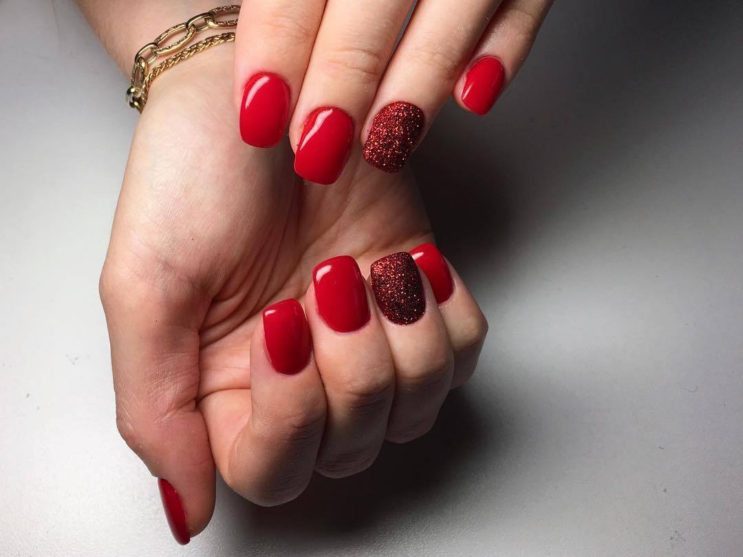- Красный, зелёный, золотой – это цвета, которые в тренде практически каждый год. Можно сделать однотонные красные ногти, а безымянные пальцы выделить зелёным цветом.