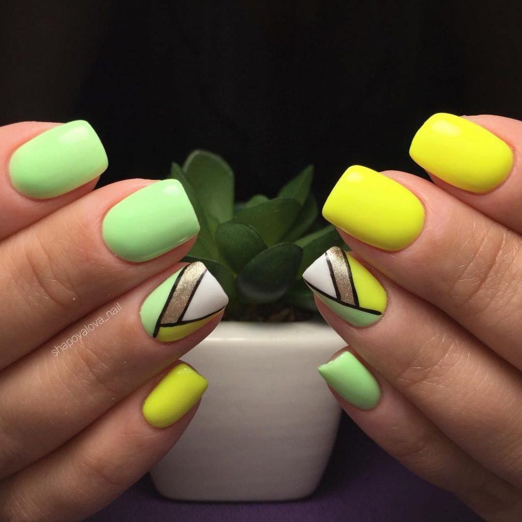 Применяя актуальные оттенки в дизайне изображении геометрических фигур, можно создать модный маникюр на средние ногти квадратной формы. Геометрические фигуры идеально дополняют элегантный, пляжный или спортивный стиль. При этом геометрический дизайн выполняется на двух или трех ногтях, чтобы сделать акцент на красоте и стиле.
