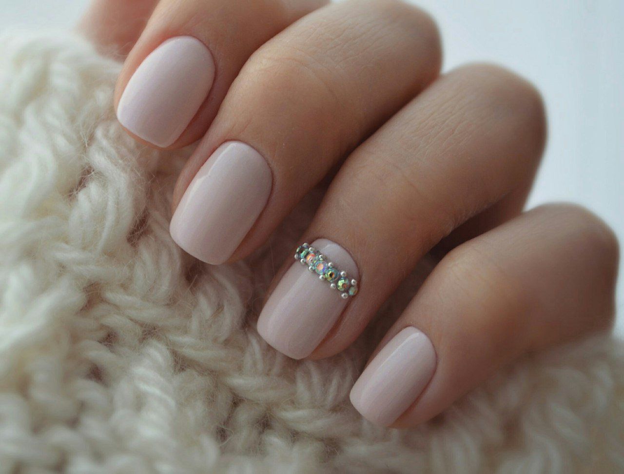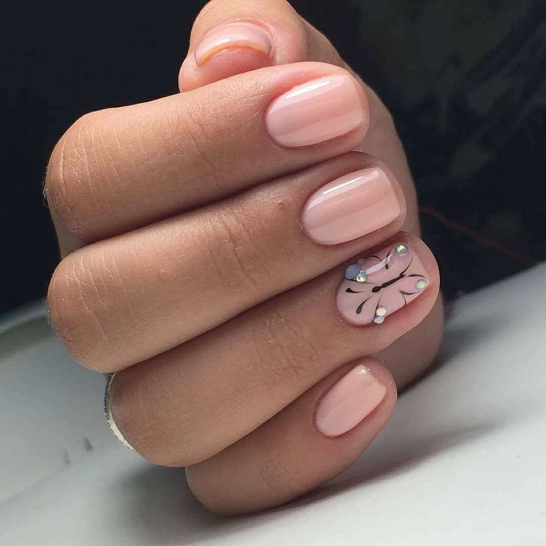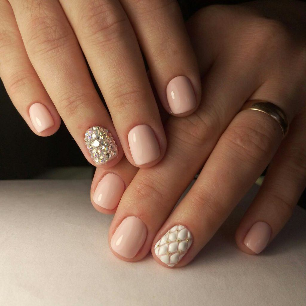 - Спокойные нюдовые цвета. Универсальный дизайн со спокойными тонами визуально увеличит длину пальцев, подчеркнет красивое кольцо, выделит декор и блеск.