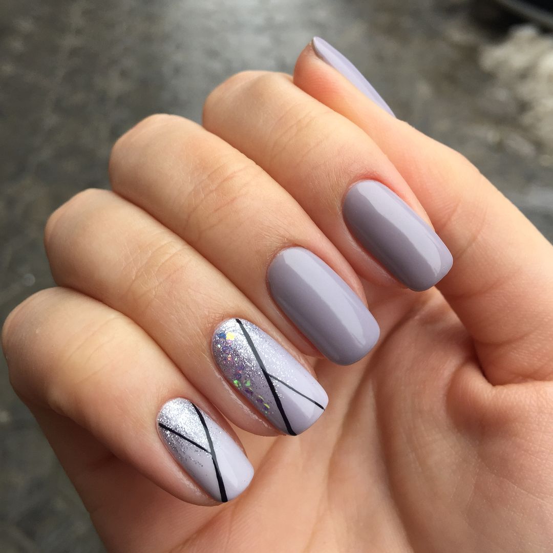 Комбинированный маникюр с интересными элементами в сером цвете.
