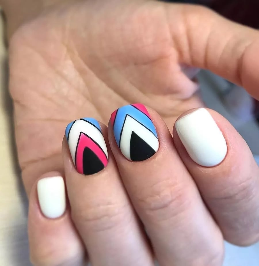 Оригинальный маникюр с треугольным рисунком, белый и персиковый лак, серебристый лак.