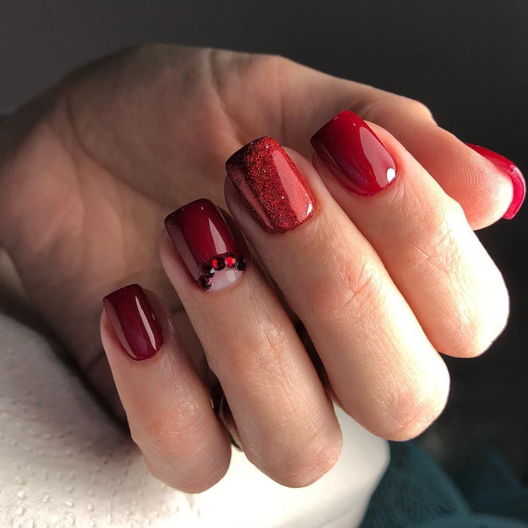 Маникюр на короткие квадратные ногти хорошо смотрится в глянце, но особенно шикарен в матовой текстуре. Бархатистые квадратные ноготки насыщенных оттенков смотрятся благородно и элегантно и это впечатление не портят даже крупные стразы и яркие блестки.