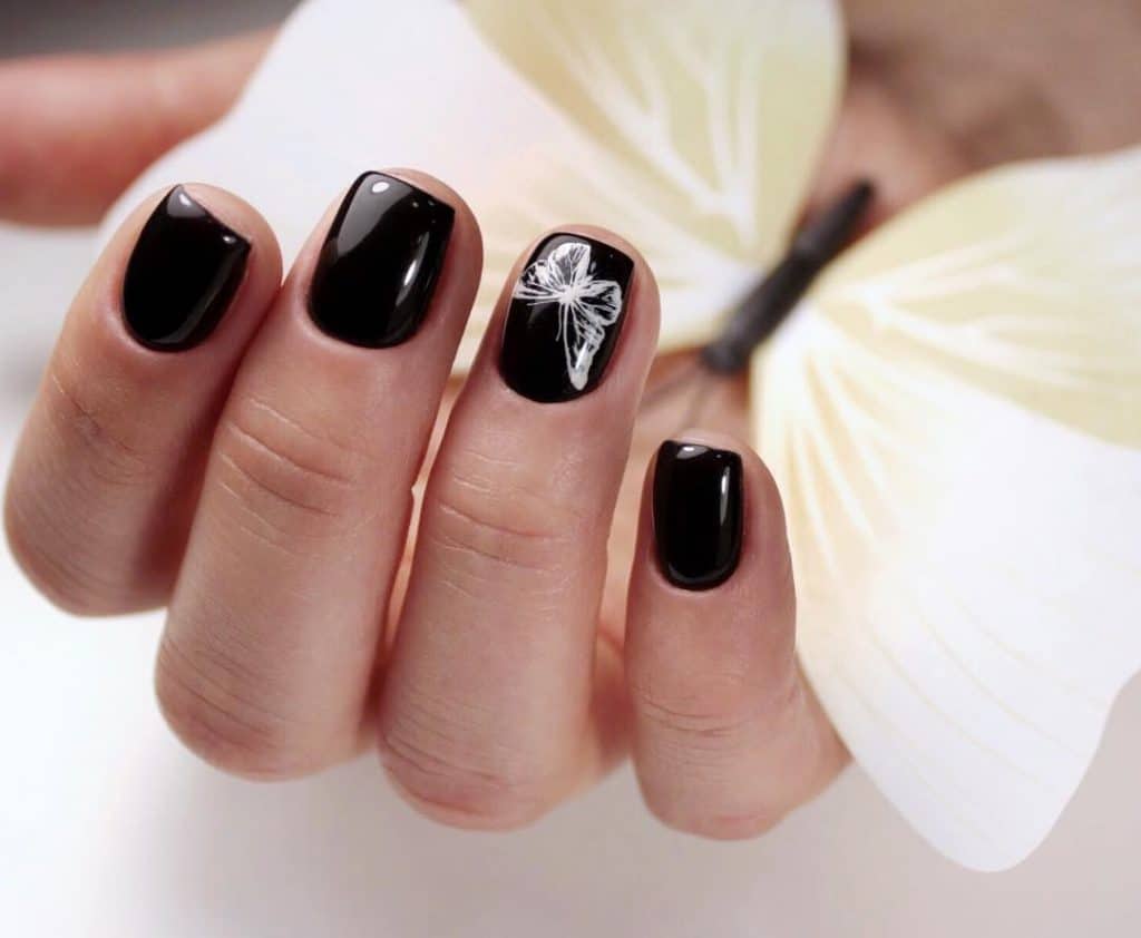 Черный маникюр эффектно смотрится на квадратных коротких ногтях.