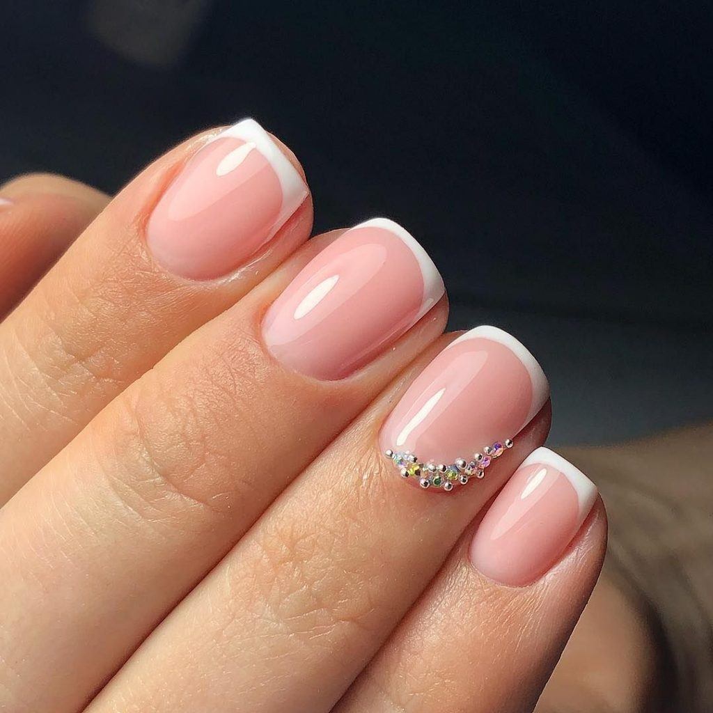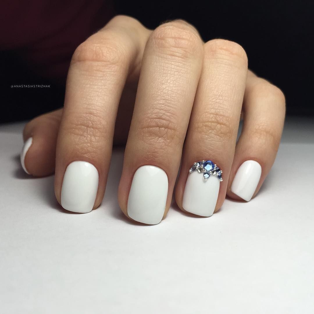 Короткий квадрат отлично сочетается с декоративными аксессуарами. Самый популярный вариант – стразы. Но, используя стразы, стоит помнить, что «квадрат» пусть и короткий, довольно хрупок, и элементы декора лучше всего располагать по середине ногтевого поля или у основания ногтевого ложе, но никак не на кончиках ноготков.
