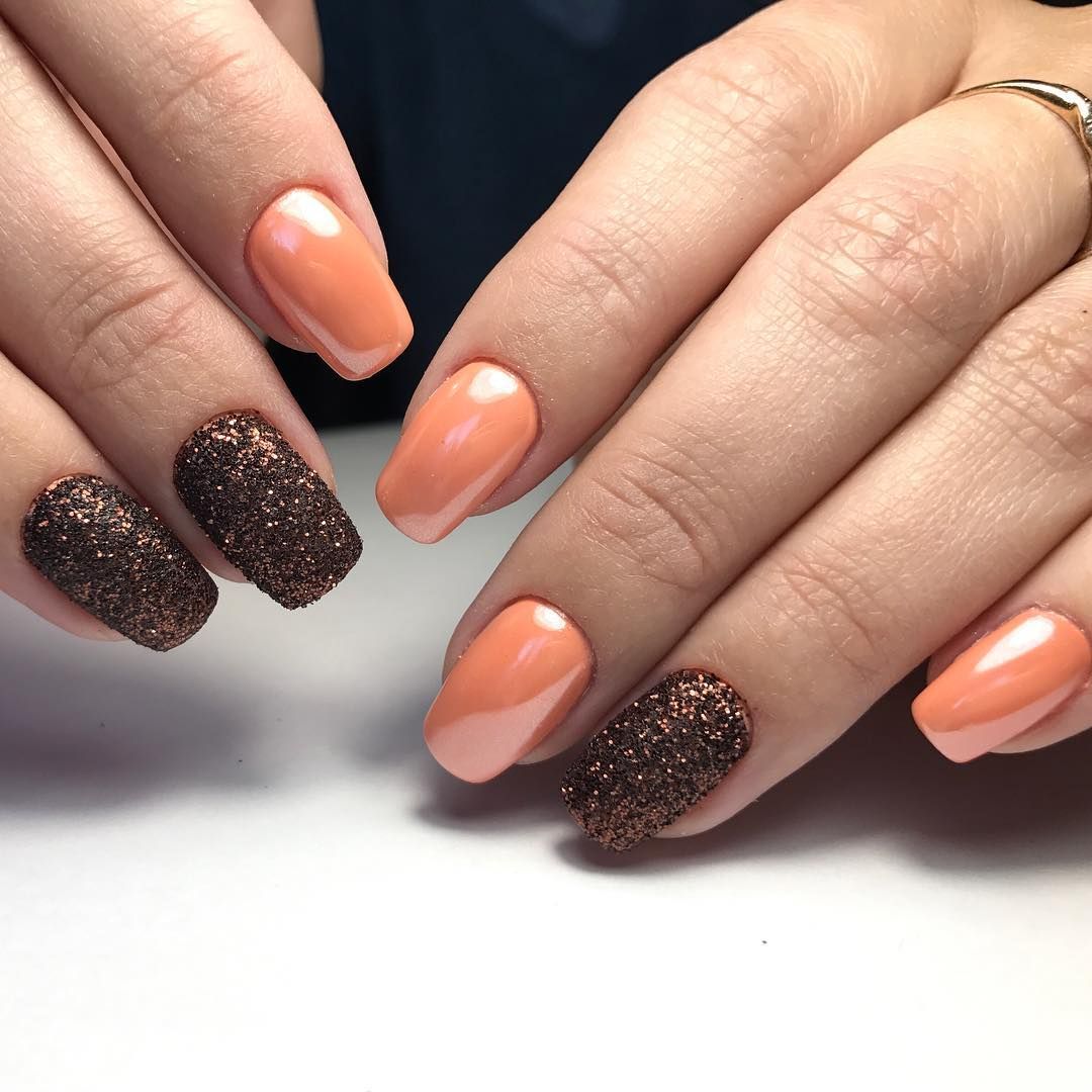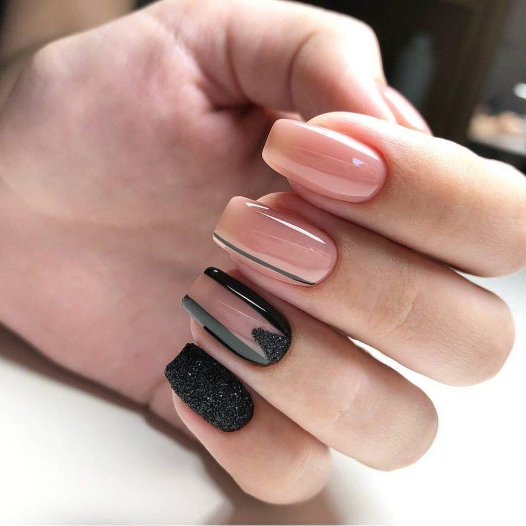 Стильный маникюр на ногтях с блестками, черный гель-лак, бежевый лак.