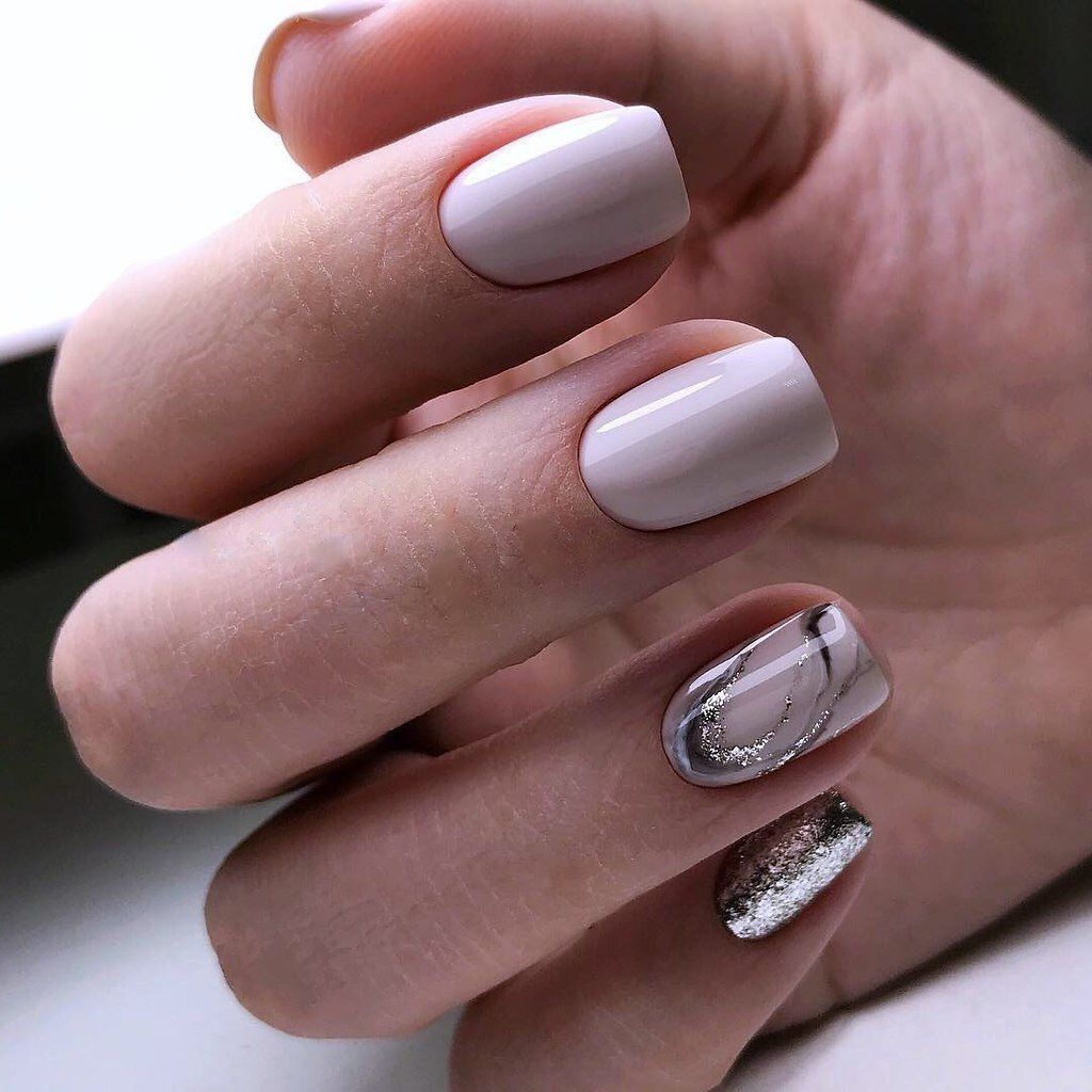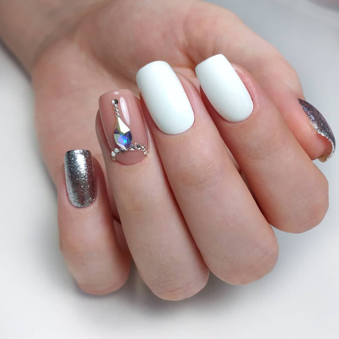 - Серебряный, металлический, белый. Самые актуальные оттенки, подходящие под любой цвет и стиль, а их сочетание между собой придает особый шарм. Такие цвета идеальны как для праздника, так и для офиса. На белый цвет хорошо наносить стразы, пайетки, глиттер, гелевую паутинку, а на нескольких пальчиках сделать современную технику стемпинга с подходящим рисунком или надписью. Из серебряного и металлического оттенка можно сделать как однотонные ногти, так и дизайн на них.