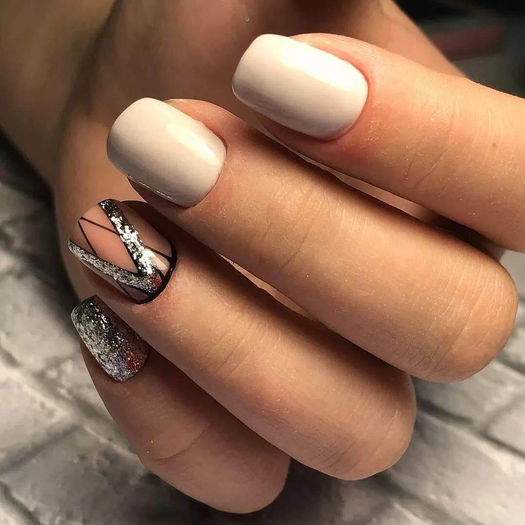 Короткие квадратные ногти покрыты белым лаком, с акцентом на среднем пальчике в виде серебряной лунки, и красивый рисунок на безымянном пальчикке на прозрачной основе.