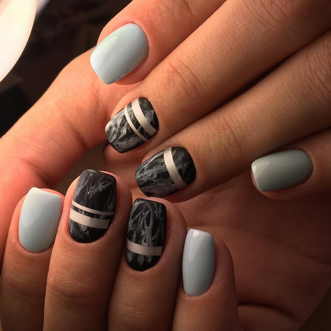 Модный интересный маникюр черный голубой гель лак.