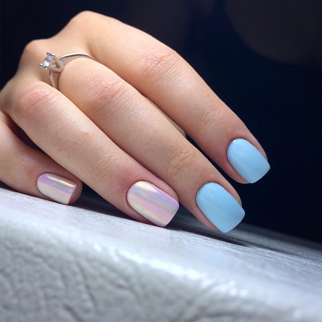 Пастельный маникюр в серо-голубом цвете с техникой битое стекло.
